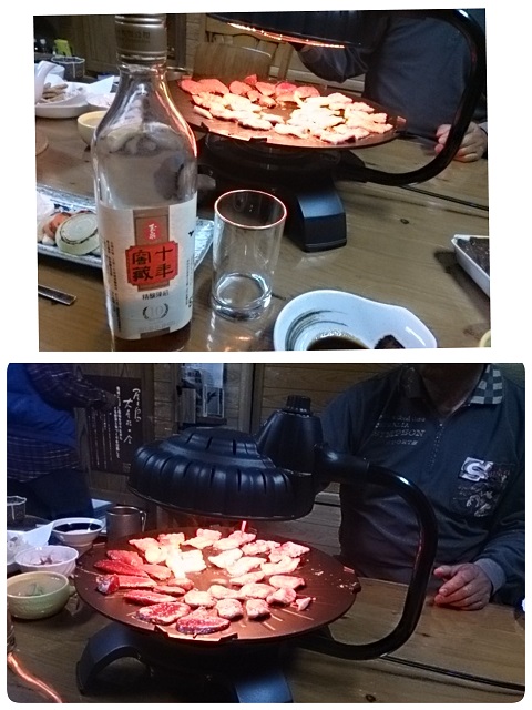 10月のたいわん旅行たった49800円で四泊五日 観光食事付ツアーもちろん 往復はそれも機内食あり おまけに食事時飲み放題?よって・・・・食事 不味くはないけど肉食女子自認の育ち盛り女子にとっては栄養?不足 肉足らんは否めん事実旅行中も綺麗な景色とともに 食事内容 逐一ラインであちこちに発信シマ友達に「肉 食べたいぁぁぃ」即返信「帰ったら 肉パーティしよっ!!」互いに多忙で時間流れ先週日曜日にやっとバーベQ忘年会する運びにおっちゃん深夜の通販番組見てて購入したとゆう遠赤外線のバーベキュー器械のお披露目ってことです六時にお宅訪問ところが・・・・午後から雨がパラパラそんならと早めに畑仕事終えて 温泉行決定三時に温泉行きましたいつもの顔ぶれお仲間さんと愉しい会話楽しむも早々一時間で慌てて出ててつと散歩行っても まだ四時相手の支度状況もあるからそんなに早く行ってもそやっ畑肥料依頼してた釣り名人さんのお宅に「引き取りに行ってもよいじゃろか?」あちらも雨でポ●カン収穫作業は早じまい「よかぁ いつでも ヨカよぉ」テツパチーノ 肥料10袋 積み込んでる間に名人さんポン●ン ちぎって持って帰れぇって欲と道連れさすがに細い枝に乗るのは諦めて近場の枝に垂れるポンカ● ゲット半分訪問先の手土産に・・・結局宴会開始時間ぴったりにお宅到着 まずは乾杯テツパチーノは持参したタイワン土産の10年モノの紹興酒おっちゃん 焼酎 女子はワタシはもちろん ノンアルおっちゃん自慢の焼肉器凄い熱量にびっくり それにしても忙しいどんどん 焼けて食べるスピード 待ったなし メーンは猪ニク しか肉 焼き鳥うちからは鶏の貴重部位 尻の周り 通称ボンボリ 首の部分 通称松葉ナニワで買って 冷凍して保存こんなの初めて食べたと感激されて・・・・食べて 喋って大笑い外は寒そうだったけど室内はストーブの火がチロチロ暖かいみたらなんと まだ七時半お腹まんちくりんなれど次々出されるいろんな小皿につい手が・・・シマライフ満喫してるご夫婦の料理は創意工夫された逸品ばかりMy畑で作成されたモノ全て 工夫して利用の幅また次々 話の幅広げていきます今度見たら九時半ほな ぼちぼちって云いつつまた 次の話題に互いのこれからの暮らし 生き方話して 大いに同感隣のテツパチーノ訪問先のおっとちゃんもしっかり酔いが回って 眠そうで・・・今度こそ お暇宣言してみたらひぇぇぇっ11時半慌てて 荷物まとめて帰宅したのは シンデレラ五分前しかし我ながらよぅ遊ぶ よぅ 喋った夜でした