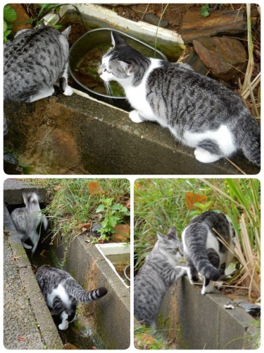御近所の兄妹おかーさん 留守の時ワタシ慕って?遊びにきますおやつ おかーさんから預かってて 適量?あげるから 懐いてるのかと・・・二匹 今風のキラキラネームあるんやけどそんなモダンな名前覚えられんしぃ勝手に名づけて呼んだらお利口二匹ちゃんと「ニャア」って返事今日も『たまぁ~~っ』 『クマァァアアアアアッ』どこからか走ってきて まぁ かいらしい かいらしっ!! 裏に積み上げてる薪が遊び場 ネコ嫌いのてつ公も二匹には寛大 先日 もっと親しくなって欲しいからたま抱き上げててつの傍に途端強烈な猫パンチ一撃可哀想なのはてつ公訳も判らずパンチ受けて・・・・以前 てつのこともあっては好きでなかった・・・・けど・・・・人疑う目もせず足元でじゃれつく二匹の姿みたら・・・・最近帰宅すると車みるなり出現「てつ」と「たま&くま」夫婦二人の暮らしの優しいエッセンスになってます