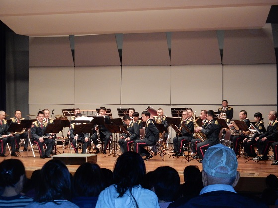 じぇー隊の吹奏楽団あちこち遠征コンサートされてます前日までお隣のタネが島で・・・・戦地仕様の装甲車試乗会終えて本来の目的 吹奏楽団の演奏聞きに行くことに午後二時開演には充分余裕あり最近 また足の痛みの出てきたテツパチーノ気遣い 足元広いスペースの椅子席ゲットじぇー隊のおねーさんが司会コンサートは順調に進みます お堅いとばかり思ってたじぇー隊楽団員の寸劇まであって想定外に面白く・・・ 観客の年齢層 見てのコント?こーもん様 テーマソングまで・・・第二部は勇壮なアフリカンミュージックで始まりシマの唯一の高校吹奏楽部とのジョイント演奏も じぇー隊吹奏楽団に一歩も引かん見事な演奏に感動最後のフィナレーは拍手喝采これで終わりかと思ったら「アンコール あんこーる」大合唱の声シャイな島人に似合わん 大きなコール声の主 みたら・・・・あははっやらせ?隊員さんでしたコンサートの終わり方も巧い一人一人 演奏しながら客席通過 最後は司会者のみまったりとしたココロになって素晴らしいコンサートは終わりました無料でみんな素敵なコンサート観れるのもシマで暮らしてるお蔭?会館出たら大雨に・・・・あちこちショッピング寄り道して帰宅したのはココロの晴れ間と反比例もう真っ暗な時間帯でした