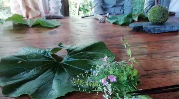 お仲間 七人 現地集合午前の部の客は子連れが多く彼らの賑やかさに代わりうちら 落ちついた雰囲気で食事スタート つわ蕗葉っぱで エコ皿まずは 軽く目を閉じ 全員で瞑想内心は 「早く食べた~~~いっ」二時開始のランチはお腹空き空きぃ~ 最初に地球 いろどりサラダ配られて・・・次々 持ってくるのは手間暇かけた星たち こだわり具材の説明聞くたびに クビこっくんこっくん「へぇぇぇ~ ほおおおっ~ へっへっへぇぇぇっ」 ↓デザート感覚 タ●カンとあんの~芋のみるふぃーゆ ワタシは太陽をセンターに ↑テツパチーノは性格伺わせる 上品な飾り付け以上のこだわり野菜寿司とさやえんどう&若竹のおスマシなんとも 健康志向ですこと でぇ・・・・ ランチ価格 ハゥ マッチ!?寿司の制作者 最後に挨拶に来ました我慢とゆう文字 ワタシの辞書から消えて数年 つい本音「すこしは 肉系欲しかったわぁ」「シマの食材にこだわってますからぁ」「ほんなら シカ肉もシマ産やんかぁ!!」聞くと 最近はなかなかシカ肉も入手できんらしいですうちでは普通にテツのにしてるのにねぇ遅いランチと考えてたから 夕食の用意は脳裏に無しけど まだまだ育ち盛りやもんで~慌てて 冷蔵庫覗いて晩御飯献立考えることに帰り道 前日トイレの窓閉めに行ってくれたアネサンがフルーツサラダ作ったから取りにおいでってゆうてくれてたから 一品助かりましたVEGETARIANが大喜びしそうなお寿司うちら夫婦はやはり モノ足りんってのが本音です