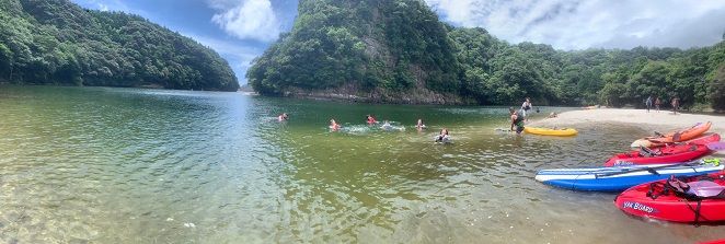 カミサマの粋な計らいと感謝 帰阪日も充実した時間過ごせました 五年前の来島時 想定外ハプニングあって帰る日 大幅に縮小して飛んで帰ったこと 今思い出しても今回 きっちり損失補てん?と考えたら ちゃんと帳尻合います起きてすぐ 運航状況の確認通過もダイヤの乱れ考えて 2日後に変更 それが正解かと・・・朝8時にガイドさんと 2日目に遊んだ川で再びサップボード楽しむことに持ち帰りのトランク詰め終えて ルンルンでおでかけワタシは布団干したり シーツ洗ったり・・・10時半にスーパー立ち寄りながら りぃちゃんの迎えに・・・到着予定が遅れてるとの連絡川岸からりぃちゃんの勇姿観るため 撮影スポット探して遥か彼方から りぃちゃんらしき姿発見 着替えすませ 慌てて帰宅昼ご飯食べて トランク積み込み完了 てつとお別れの挨拶余裕あるから 時間来るまで あちこち観光 海に落ちる滝みて・・・ 次の観光は午前中サップした川 高い橋梁から覗き込んで・・・ まだまだ時間あるから ソフトも食べて・・・ 早めに空港着いたけど 欠航騒ぎの余韻まだまだあるのか 狭い構内大混雑一時間以上かかって やっとチェックイン20.2Kのトランク表示に愕然200gの余裕あったはず きっと間際に入れたマリンシューズのせいかもね細かいことは言わないシマの会社 なんとか セーフ安全検査終えて りぃちゃん待合室に・・・・あっさりとした別れの後 うちらは近くのスーパーで買物買物終わって 駐車場でりぃちゃん乗った やりきった感ひしひしそりまま 爆走 目指すは海そば温泉りぃちゃんと もう一度入りたかったなぁ満潮間近 30分だけ楽しめました 昨日は三人で入った温泉 今日は1つのピース欠けてさみしぃ