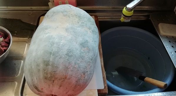 旅日記 休みます テツパチーノ作の巨大冬瓜&サラダ等 今夜のお別れ会に持参今夜の参加者 子供も入れたら17名 まさしく 老若男女グループです 完全無農薬野菜そのもの テツパチーノ作品評判いいのは当り前持参した材料全て テツパチーノの畑育ちですぅ そしてラッキョウの酢漬けも提供日々の食卓 代わり映えのせん料理ばかり参加者の一品持ち寄りはとっても豪華な彩り 宴盛り上げるのは焼酎 スィーツも 参加者の手作り 明日は またG・の試合に参加せんならんから早めにお暇告げて帰ろうとしたら横に座ってたスタッフさん「これ なんですかぁ?」えへへっワタシ 寛ぎ過ぎて 履いてた靴下 スルスル脱いではるか彼方に蹴飛ばしてたみたい 恥ずかしいからポッケに両足ソックス突っ込んで 明後日でシマ離れるスタッフに見送られて 今夜は月夜夫婦 そぞろ歩きして帰宅都会から 帰島して六日すっかり いつもの暮らしに戻ってきたようで・・・