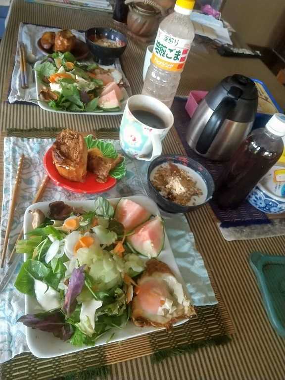 夏野菜は 自家製オンリー いまんトコ 野菜は不自由してません 畑人 テツパチーノに感謝 👆 オレンジ色ぶらじるパッション 味はなんやけど~ フルーツ買わんでエエから我慢せんとねずっと遠くのにわか雨が時々激しく降るものの曇りがちただ風の強さは半端なしお陰で暑さ感じることもなく 扇風機でさえ夜は不要それだけなら 嬉しい環境なれどと強風のせいで 月曜日から三日間欠航お陰さんでうちの冷蔵庫 冷凍庫普段からフタできんくらい満杯状態だから支障は感じないけど~火曜日の特価意識して卵を使い切ってたのが無念今週は久しぶりにお好み焼き作って御世話になってる人たちにおすそ分け予定してたから昨日 例のマンゴ農家さん 「また落下したモノあるよ~ 要るなら取りにおいでって」卵買いに行かないとぉ~ 欲しいのは山々 けど行けませぬと甘えますラッキーなことにマンゴー持ってくるついでに冷蔵庫の卵してくれるって 其処まで全て エエ風に流れてるとおもいたいけど 一番 待ってる洗面台乗り場で ずっと乗りこみ待ちしてるみたい先日の漏水事件 蛇口からも水漏れ露呈 死ぬ気で新調覚悟洗面所の蛇口 使用するたびに元栓開いての利用さすがに 疲れてしまって今は隣の風呂場で 洗顔 歯磨き継続 もう四日目になりました (号泣!) 本来ならナニワでの枠賃接種予定 その交通費 浮いたと思ったのは一瞬それ以上の出費に泣いてます