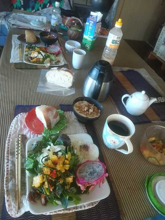 雨続きで この漁港 テツパラダイスに来たのは何時以来?ダレも居ないこと確認 テツは ノーリード 晴れてフリー 先に朝食とって カレの好きなことさせますここでも 水は不可欠 二本のペットボトル飲み干す愉しさ 頭上高くなってるに感謝 自然と カノジョのにーなちゃん 来ないかなとチラチ~ラ もう 長く逢ってないなぁあんまり此処に長く滞在してたら 帰りの県道アスファルトでやけどするやも~慌てて支度して 30分で帰宅お隣さんから 嬉しいプレゼントテツパチーノが受け取って テーブルの上に 先に撮影するの忘れて 半分に切ってから昔懐かしい 優しい味のパンカノジョの優しさ閉じ込めてましたお返しに 自家製野菜利用かぼちゃとオクラの炊き合わせ 自由に調理してほしかったけどカノジョから「どうせなら煮たものが善い」とババくさい料理 この地の若者にはなんでか人気頂いたパンの横に 初収穫したものはて これはなんでしょぅか?