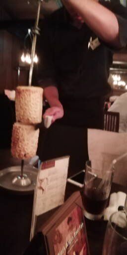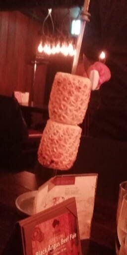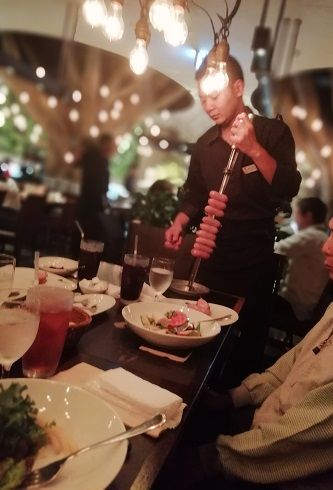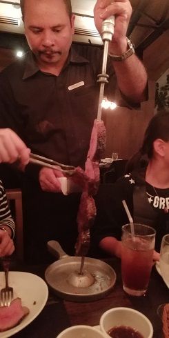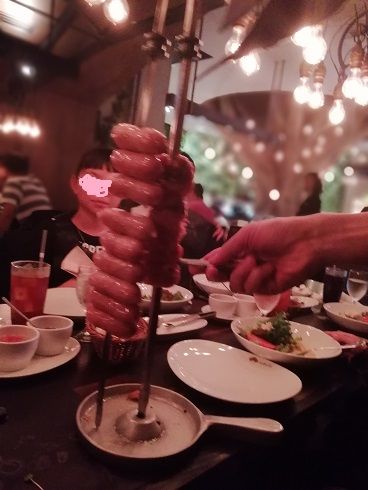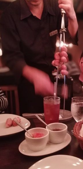 彼らが次々長い剣みたいなものに突き刺してテーブルまで配達するモノ