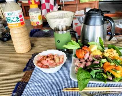 イバラキ和子さん ただいま入院中手術後の報告等ラインで知らせてくれました寒くなって 布団冬物 下着も冬用に替えたそうですこちら昨日今日 異常な暑さ クーラーなしで暮らせません ヌルメ温泉駐車場に たわわになってるバナナ昨日おこなった Tさんの三回忌のお話です温泉に行き 帰宅後荷物もって当日会場喫茶店にTさん ずっと御贔屓の喫茶店 ママさんとも懇意 去年の一周忌もこちらで・・・・飲み物は持参 メーン料理はお弁当依頼(ヴィーガン用の肉なし 肉もどきの大豆ハンバーグ 発芽玄米のごはん あとは忘れた 記憶なし) 悲しすぎて 写真も撮らずうちはテツパチーノファームのとれたて野菜 オールスター勢揃いのサラダ&十角へちまのスライス 折角のサラダ ドレッシングにこだわって市販のものするには しのびない会に出席するイタリアンレストランオーナーシェフに依頼へちまのほうは ワタシがアドバイスしてマヨネーズ醤油にからし少々 オーナーシェフ以外 参加者揃い あとは ドレッシグ いや失礼オーナーシェフカップル待つだけMちゃん「彼はいつも 荷物がおおいのよ だから 時間丁度に来たことないよね」しばらくすると 少し遅れると連絡あり30分遅れて シェフ参上 極上手作りドレッシング持ってみなで 乾杯一番人気は・・・・ いちびり屋のMさん 眉毛に味付け海苔はるのが十八番三回忌とゆうことで お数珠持参 夫婦控えめの洋服着ていったけど・・・・・数珠一度も出すこともなく まるで プレ忘年会もどき 故人の話も少しでたけどね途中 Aさんご夫婦 週末の運動会の打ち合わせあって中座シェフが 自分用として持参されたキーマカレー皆の視線 集中シェフ 結局 視線の熱さに負けて少しずつ皆におすそ分け さすが~プロの味 たった三口で食べつくしたけどドリンクは・・・・シェフのカバンから 手品のように次々高級ワイン 入手困難な洋酒 ラム酒 シャンパン・・・・普段 たくさん呑めないテツパチーノも勧められるまま 数杯おベント 食べつくした後 登場したのは女子三人 自慢のスイーツ勢揃い マロン・マフィン そこで A夫婦カンバックそこからはシェフのつま弾くギターに合わせ生バンドみたく カラオケ大会 なんとも贅沢です シェフ ギターとアンプも持参 大荷物の謎解けました曲目は 70年代のフォークソング 詩に酔いしれて なみだするママちゃん ビートルズからべんちゃあず 洋楽から ど演歌 リクエストに応えて私 天城超え熱唱 皆さんも一緒に歌って大合唱 宴は最高潮 六時スタート 宴の終焉見えず 毎朝 五時起きのテツパチーノ辛らかろうと 「明日 牛乳配達の仕事あるから ぼちぼち 失礼します」それが口火に後片付けスタート 居残り隊 五人に見送られて 10時半帰還 帰ってすぐ テツパチーノ真っ暗な畑にドラゴン様 また 三輪開花してたそうです今日 お世話になったママちゃんに 絶賛された十角へちまと畑の柿 持参して 再度のお願いしてきました「忘年会 また しましょ」今日 G・⛳に行ったら 92歳 最長老のじいさま「今日は あのコ 外人さん 来んのかぁ」⛳会長もこーりーちゃん べた褒め「あのコ 品があったなぁ~ やっばり 判るなぁ 育ちがよいと~」日本のハハ なんか嬉しくて鼻ぴくぴく今日も一緒に朝散歩 明日も一緒に遊ぼうと約束してます