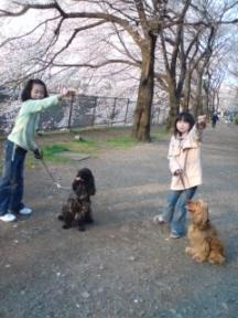 桜も咲き、気持ち良い散歩道。つい最近まで寒くて、散歩していてもワンコ友達になかなか会えなかったのに、桜と共にワンコ友達も自然に集まってきました~!!娘と娘のお友達も合流 スパイクもルビーも大喜びゴールデンのミッキーちゃんのお父さんから言われて気づいたのですが、ルビーは人見知りだったのに、おじさんにもすっかり慣れ、甘えるまでにおじさんのおやつ攻撃が花開いたようです。 スパイクはいつもいろんな人から「なつっこいね~」と言われる。外では甘え上手な様です。明日もお散歩楽しみ~