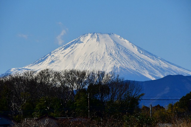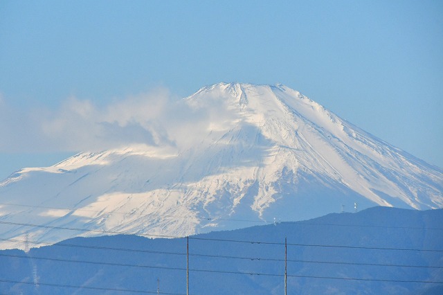 今朝10時近くの富士。山の写真としては時間的にちょっと遅い。光線がだいぶフラットになっている。眼を右にやると、丹沢主脈の峰々。昨日の下界での雨は丹沢にだいぶ雪をもたらした様子。中央のなだらかな峰は丹沢山。そして右端は丹沢の最高峰蛭が岳。眼をさらに右に向けると、そこには奥多摩の名峰大嶽山が。潜水艦のような山の形なのですぐ分かる。奥多摩の山々は三頭山をはじめいくつか登っているが、この大嶽山だけは敬遠していた。というのは山小屋の管理人の気がおかしいというもっぱらの噂だったのだ。でも、それはもう何十年も前の話。今はそのようなことはないのだろう。