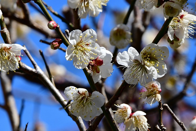 庭の梅の蕾が一輪ほころんだ2月8日。あれから2週間たった今日。もう満開!この寒さで花も少し傷んできた。と、そこへ一羽のメジロ。メジロは行動が素早い。Nikonの遅いAFではメジロの動きを追うのが大変。それでも何とか捉えることが出来た。梅の花の蜜を食べてちょっと一休み。平和なひと時だった。
