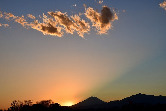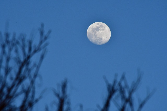夕方、散歩に出た。行く手の北東の空。葉が落ちた桜の木の上に、ほぼまん丸の綺麗な月が出ていた。桜の小枝が、お出で!お出で!をしているようだ。月に夢中になっていたが、ふと振り向くと西の地平線近くでは陽が落ちて行くところだった。日没の地点も箱根から少し富士山に近づいてきた感じがする。春のダイアモンド富士が見えるのはいつごろになるのだろう?