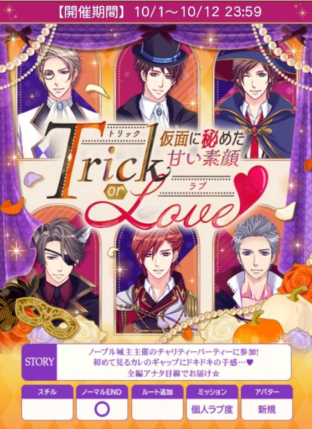 ‼️注意‼️6日20時早期FV→後半早期FVに変更あり‼️🌹メンテナンス 7日8:00~12:00時🍀アンケート7日&8日迄【10/1日(水)~10/12日(日)】『Trick or Love◆~仮面に秘めた甘い素顔~』🍀総愛&早期詳細&FV予定は前半参照♦️オリバー♦️stage1A:そうです★B:違いますstage2A:一緒に頑張るB:休憩を促す★stage3(H)A:オリオリ…?B:素敵です!★stage3(N)A:任せる★B:断る♦️リュオ♦️stage1A:『劇』の企画を見る★B:『歌』の企画を見るstage2A:わからないよ★B:そうじゃないよstage3(H)A:B:stage3(N)A:まあな★B:さあな♦️シオン♦️stage1A:してあげる★B:たしなめるstage2A:知らないことばかりだったよB:勝手にごめんね★stage3(H)A:フォローに入るB:シオンたちに任せる★stage3(N)A:筆の代わり★B:歯磨き用🌹50文字の纏めオリ1そう2休憩H素敵N任せる◆リュ1劇2わからないH?Nまあな◆シオ1あげる2勝手HシオンN筆