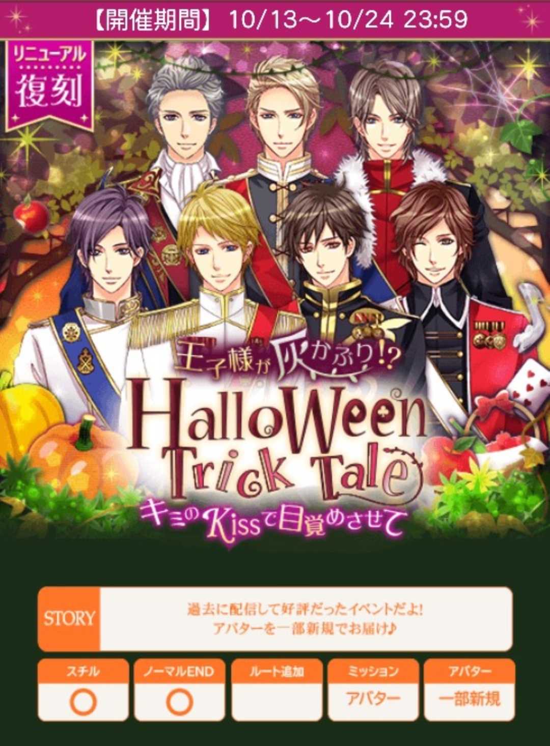 🌹アプリでは初配信イベントになります🍀アンケート19日迄🌹アニバーサリー馬車交換24日迄【10/13日(月)~10/24日(金)】『【復刻】王子様が灰かぶり!?Halloween Trick Tale~キミのKissで目覚めさせて~』★個人ラブ度特典■25,000「銅の鍵(ジン)X3」■42,000「銅の鍵(ジン)X4」■50,000「銅の鍵(ジン)X5」■63,000「銀の鍵(ジン)X3」■75,000「銀の鍵(ジン)X5」■100,000「アナタに大きな愛をbyジン」■120,000「でか王子の鍵」★個人ラブ度特典「1着クローゼット」■8,000■16,000■24,000■32,000■40,000■48,000■56,000■64,000■72,000■80,000■88,000■96,000■104,000■112,000■ロイ早期10/15日24時迄に2H√クリアで「月夜の願い事」■早期10/18日20時迄に4H√クリアで「リンゴの木下でデート」■後半早期10/22日24時迄に6H√クリアで「魔法の鏡でおまじない」★F予想■ロイ 10/13日12〜24時■ロイ 10/14・15日20時■早期 10/16日20時■早期 10/17日20時〜7/18日20時■後早 10/18・19・20・21・22日20時■中間 10/23日12〜24時■ラス 10/24日12〜24時自愛8,000総愛1H√15,000 (7,500)2H√37,500 (17,046)3H√59,000 (24,584)4H√89,000 (34,231)5H√127,500 (45,536)6H√168,000 (56,000)7H√212,000 (66,250)1N√182,400 (53,647)2N√205,200 (57,000)3N√228,000 (60,000)4N√250,800 (62,700)5N√273,600 (65,143)6N√296,400 (67,364)7N√319,200 (69,392)単価22,800♦️ヘンリー(シンデレラ)♦️アバMエマージェンシー手錠さわやかハロウィンブラウスstage1A:興味がない★B:一緒と思われたくないstage2A:駒を打ち直すB:笑う★stage3(H)A:諦めるB:さらに追及する★stage3(N)A:謝る★B:戻りたくない♦️ジーク(かぐや姫)♦️アバMリップハートピアスコウモリ付サングラスstage1A:分かったと素直に聞く★B:何故だと理由を聞くstage2A:そのまま様子を伺うB:声をかけてみる★stage3(H)A:ハンスに連絡するB:一緒に暮らすことを提案する★stage3(N)A:家まで戻る★B:クオンを説得する♦️クオン(白雪姫)♦️アバMセクシーハートトップスハロウィンかぼちゃパンプスstage1A:俺に家なんかないB:実は今、帰るところがない★stage2A:政略結婚のことを伝える★B:政略結婚のことを伝えないstage3(H)A:警戒するB:感謝を伝える★stage3(N)A:私って本当ラッキーかもと微笑むB:感動で言葉にならずただ微笑む★♦️ケヴィン(赤ずきん)♦️アバMセクシースリットの囚人スカートひっつきパンプキンstage1A:道案内を頼む★B:道案内を断るstage2A:もう少し進もう、と言う★B:そうかもな、と足を止めるstage3(H)A:頭を撫でる★B:また離すstage3(N)A:その意味を尋ねる★B:勝手に解釈して納得する♦️オリバー(人魚姫)♦️アバMレッド囚人ブーツハロウィンマジカルスティックstage1A:海にもどろうとするB:繋いだ手に力を込める★stage2A:大きく頷く★B:ただ見つめるstage3(H)A:ベッドの隣★B:自分の脚stage3(N)A:泳ぎは得意?★B:好きな童話は?♦️マックス(不思議の国のアリス)♦️アバMキュート囚人ハットさわやかハロウィンスカートstage1A:もう一度否定する★B:諦めて否定しないstage2A:抱き締め返す★B:冗談を言って誤魔化すstage3(H)A:何でそう思ったの?★B:知り合いじゃないstage3(N)A:唇で取ってあげる★B:指で取ってあげる♦️イヴァン(ラプンツェル)♦️アバMドッグタグチョーカー水色キャンディピアスstage1A:問題ないと言う★B:必要ないと言うstage2A:ダメだと言うB:怖くないのかと聞く★stage3(H)A:礼だと言うB:約束したと言う★stage3(N)A:素敵な力だと言う★B:お礼を言う■50文字の纏めヘ1興味2笑H追及N謝◆ジ1素直2声H一緒N家◆ク1実2伝えるH感謝N感動◆ケ頼む2進もうH頭N意味オ1繋いだ2頷くHベッドN泳ぎ◆マ1もう一度2抱き締めH何でN唇◆イ1問題2怖くH約束N素敵🌹ランク特典■1〜90位■1〜100位(アプリ)「かぼちゃの馬車でお出掛け」「金の鍵(ジン)X7」「でか王子の鍵」■1〜380位■1〜400位(アプリ)「人魚姫の誘い」「金の鍵(ジン)X2」「でか王子の鍵」■1〜800位「魔法のリンゴ狩り」「金の鍵(ジン)」
