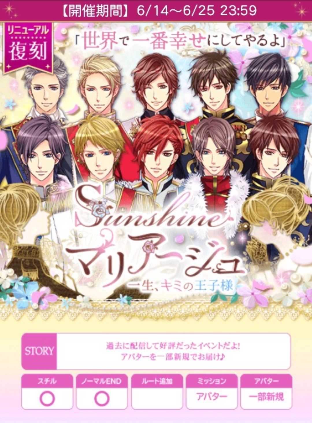 🍀8H√数値修正です。失礼しました🙇🍀ジークH正解A「夢じゃないことを証明させる」は過去配信時ではラブ度UPを確認していましたが、今回の復刻ではUPがありませんでした。失礼しました🙇【6/14日(土)~6/25日(水)】『【復刻】Sunshineマリアージュ~一生、キミの王子様~』★個人ラブ度特典■25,000「銅の鍵(ヘンリー)X3」■41,000「銅の鍵(ヘンリー)X4」■45,000「メッセージ入りスチル」■50,000「銅の鍵(ヘンリー)X5」■60,000「プロポーズの手紙(10人分)」■63,000「銀の鍵(ヘンリー)X3」■75,000「銀の鍵(ヘンリー)X5」■120,000「でか王子の鍵」★個人ラブ度特典「1着クローゼット」■7,000■14,000■21,000■28,000■35,000■42,000■49,000■56,000■63,000■70,000■77,000■84,000■91,000■98,000■105,000■112,000■119,000■126,000■133,000■140,000■ロイ早期6/16日24時迄に2H√クリアで「ウェディングベルが鳴る階段」■早期6/19日20時迄に5H√クリアで「ウェディングベアでお迎え」■後半早期6/23日24時迄に8H√クリアで「大聖堂で祝福を」★F予想■ロイ 6/14日12~24時■ロイ 6/15・16日20時■早期 6/17日20時■早期 6/18日20時〜6/19日20時■後早 6/19・20・21・22・23日20時■中間 6/24日12〜24時■ラス 6/25日12〜24時自愛7,000総愛1H√15,000 (7,500)2H√37,600 (17,091)3H√54,000 (22,500)4H√73,000 (28,077)5H√94,500 (33,750)6H√119,000 (39,667)7H√148,000 (46,250)8H√181, 500 (53,383)9H√215,000 (59,723)10H√249,800 (65,737)🌹ノマ総愛1N√254,100 (63,525)2N√277,200 (66,000)3N√300,300 (68,250)4N√323,400 (70,305)5N√346,500 (72,188)6N√369,600 (73,920)7N√392,700 (75,520)8N√415,800 (77,000)9N√438,900 (78,375)10N√462,000 (79,656)単価23,100♦️ヘンリー♦️アバM(4,500クルス)薄暑のリボンデコバッグstage1A:まさかB:たまたまだよ★stage2A:答えないB:わかりきってる★stage3(H)A:目をそらす★B:開き直るstage3(N)A:また犬扱い…★B:どこに行くんですか?♦️ジーク♦️アバM薄暑のタッセルチャームピアスstage1A:3日後の予定を聞くB:付き合ってほしい場所があると言う★stage2A:流行りのものを選んだB:似合いそうなものを選んだ★stage3(H)A:夢じゃないことを証明させる★B:自分も同じ気持ちだと伝えるstage3(N)A:王子たちの反応を見るB:ジークだと断言する★♦️ケヴィン♦️アバM薄暑のサイドオープンパンプスStage1A:疲れたのか?★B:腹減ったのか?Stage2A:震えてるぞB:度胸はどこへ行った?★stage3(H)A:声をかける★B:驚かすstage3(N)A:どうしたんですか?★B:機嫌悪いですね♦️シオン♦️アバM薄暑のレース台形スカートstage1A:髪型と服を褒めるB:キスしていいか聞く★stage2A:謝る★B:笑ってごまかすstage3(H)A:当ててみて★B:2人きりだからstage3(N)A:お礼を言う★B:本物かどうか聞く♦️リュオ♦️アバM薄暑の花柄刺繍シャツstage1A:虫がいたから★B:空耳だろstage2A:食べる★B:食べないstage3(H)A:上から押さえ着信を無視するB:送り主を確認する★stage3(N)A:お茶のおかわりを勧めるB:朝ごはんを食べるか聞く★♦️クオン♦️アバMパール付きリボンショルダーstage1A:絶対に言うなよB:教えてやらない★stage2A:優しく接するB:どうしたのか聞く★stage3(H)A:自由に見て、と言うB:いつかの広告コーナーに誘う★stage3(N)A:受け取る★B:受け取らない♦️オリバー♦️アバMカラーパンジーピアスstage1A:ギクッ?★B:終わったstage2A:仕事に目覚めた★B:逃げてほしいの?stage3(H)A:からかうB:弁解する★stage3(N)A:怒るB:オリバー王子のエッチ!★♦️マックス♦️アバMつば広女優帽stage1A:頑張り屋さんだねB:素直に言って★stage2A:すごく可愛い★B:無理しないでねstage3(H)A:二人なら大丈夫なんでしょ?★B:心配いらないってstage3(N)A:マックス王子に話しかける★B:ガストンに話しかける♦️イヴァン♦️アバMバッグリボンパンプスstage1A:困難に立ち向かうところ★B:具体的には言えないstage2A:悩みがあるのか聞くB:無理はするなと言う★stage3(H)A:また機会があると言うB:弾けばいいと言う★stage3(N)A:拒否する★B:理由を聞く♦️アスラン♦️アバMレースカラーフレアワンピースStage1A:肩を引き寄せる★B:頭を下げるStage2A:声を掛ける★B:黙っているstage3(H)A:どこだと思う?★B:黙ってついて来てよstage3(N)A:手を引っ込めるB:無言で見つめ返す★■50文字の纏めヘ1たま2わかH目N犬◆ジ1場所2似合H夢N断言◆ケ1疲2度胸H声Nどう◆シ1キス2謝るH当Nお礼リ1虫2食べるH送り主N朝◆ク1教えて2どうしたH広告N受け取る◆オ1ギク2仕事H弁解Nオリバーマ1素直2可愛いH二人Nマックス◆イ1困難2無理H弾けばN拒否◆ア1肩2声HどこN無言🌹ランク特典■1〜90位■1〜100位(アプリ)「オープンカーでパレードへ」(ヘンリー、クオン、イヴァン、リュオ)「金の鍵(ヘンリー)X7」「でか王子の鍵」■1〜380位■1〜400位(アプリ)「ウェルカム!僕らの結婚式へ」(ジーク、ケヴィン、マックス)「金の鍵(ヘンリー)X2」「でか王子の鍵」■1〜800位「気球に乗って愛の旅へ」(オリバー、シオン、アスラン)「金の鍵(ヘンリー)」