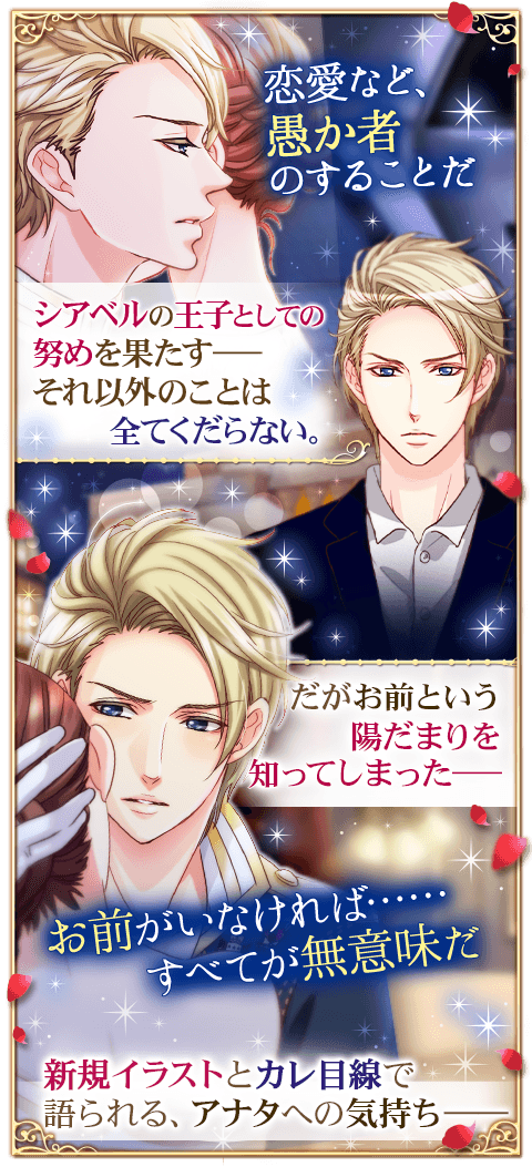 ♦️各早期必要パス枚数予測■ロイ早期その1 =20枚■ロイ早期その2 =60枚■早期その1 =30枚■早期その2 =100枚Lv3 第1話「His memories」A:構わない★B:予定は守ってもらいたいA:罪を裁くB:許す★■プリ度M 3000Lv4 第2話「His memories」A:好みは人それぞれだB:くどい★A:姿勢はマシになった★B:いい加減、足を踏むなLv5 第3話「His memories」A:手を差し出す★B:ついてくるよう促すA:騒がないように伝えるB:回復に努めろと言う★■プリ度M 5000Lv6 第4話「His memories」A:追及するB:追及しない★A:自信を持てB:大丈夫だ★★アバM■SWEET「イヴァン王子とパーティーへ」500コイン、10000クルス■NORMAL「お花付きパーティーシューズ(イヴァン)」200コイン、4000クルス■Special Story「His memories〜Special〜」Lv7 第5話「His memories」A:公私混同するな★B:誰も聞いていないA:気にするな★B:風邪ではないLv8 第6話「His memories」A:行ってみる★B:行かないA:ウォッカを頼むB:桜の酒を頼む★■プリ度M 25000Lv9 第7話「His memories」A:手を強く握るB:声をかける★A:用を尋ねる★B:立ち去る■プリンセス度Mシークレットには35000(規定値以下は通常エンドへ)シクハピ&ハピは親密度80以上、シクノマ&ノマは親密度不問Lv10 第8話「His memories」(HAPPY END)A:感謝するB:ありがとう★A:なんでもないB:素直に話す★シクハピならクリア時に『サンクト=シアベル城へようこそ(魅力300)』プレゼントエピローグ「His memories〜Epilogue〜」選択肢なし■裏ストーリーなしLv10 第8話「His memories」(NORMAL END)A:無言で見送る★B:礼を告げるA:精一杯伝えよう★B:わからないシクノマならクリア時に『サンクト=シアベル王国のプリンセスメイク(魅力150)』がプレゼント■50文字のまとめ1構わない・許す◆2くどい・姿勢◆3手を・回復◆4しない・大丈夫◆5公私混同・気に6行ってみる・桜◆7声・用◆Hありがとう・話す◆エピ・選択肢なし◆N無言・精一杯2025年1月26日配信
