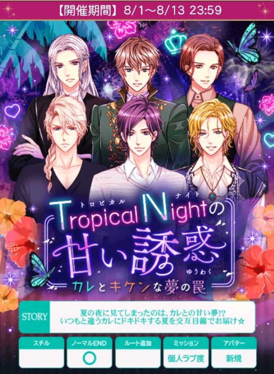 🌹8日8:00~12:00時メンテナンス🌹アンケ8日迄(2件)【8/1日(金)~8/13日(水)】『Tropical Nightの甘い誘惑~カレとキケンな夢の罠~』🍀総愛&早期詳細&FV予定は前半参照♦️ヤコフ♦️stage1A:お土産をねだるB:身体を気遣う★stage2A:追及するB:追及しない★stage3(H)A:深呼吸する★B:一度出直すstage3(N)A:キスをするB:肩を貸す★♦️エルネスト♦️stage1A:作物の実りもよさそうB:薬草も育てられそう★stage2A:彼女に会いに行くB:先に湯を浴びる★stage3(H)A:声をかける★B:そっと近くに寄るstage3(N)A:たしなめる★B:言い返す♦️レヴィ♦️stage1A:もちろんです★B:仕事場が落ち着いたらと答えるstage2A:人目が気になるか?B:暑さがきついか?★stage3(H)A:食べすぎたかもと誤魔化すB:今の気持ちを正直に吐露★stage3(N)A:多分お前の夢を見た★B:どんな夢を見たんだ?🌹50文字の纏めヤ1身体2しないH深呼吸N肩◆エ1薬草2湯H声Nたしなめる◆レ1もちろん2暑さH気持ちN多分