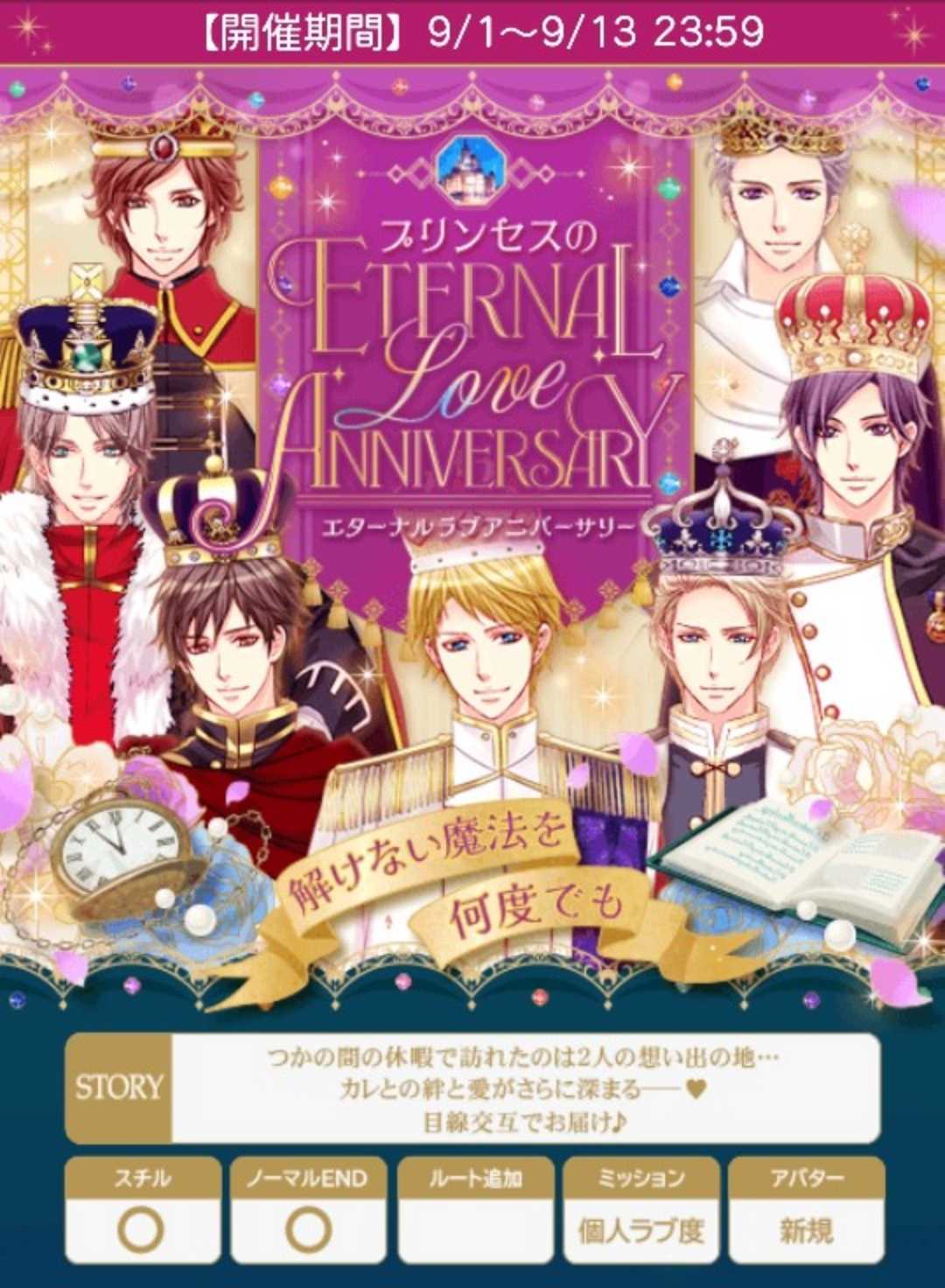 🍀ピエールsnap9/7日24時迄🌹アンケート7日迄&8日迄【9/1日(月)~9/13日(土)】『プリンセスのEternal Love Anniversary~解けない魔法を何度でも~』🍀総愛&早期詳細&FV予定は前半参照♦️オリバー♦️stage1A:大げさですよB:力になれて嬉しいです★stage2A:可愛い顔しか写ってない★B:あの時嘘ついた仕返しstage3(H)A:大成功でしたね★B:オリバーのおかげですstage3(N)A:二度寝に誘うB:おはようのキスをする★♦️ケヴィン♦️stage1A:見守るB:手伝いを申し出る★stage2A:観光客だ★B:国王だstage3(H)A:違いますよB:そうです★stage3(N)A:デートに誘う★B:一緒に休もうと誘う♦️イヴァン♦️stage1A:それでいいですB:よくないです★stage2A:折り方を忘れたB:お前に見とれていた★stage3(H)A:イヴァン様がいてくれるから★B:もう過去のことだからstage3(N)A:夫婦だからな★B:奇遇だな🌹50文字の纏めオ1力に2可愛いH大成功Nキス◆ケ1手伝い2観光客HそうNデート◆イ1よくない2お前HイヴァンN夫婦