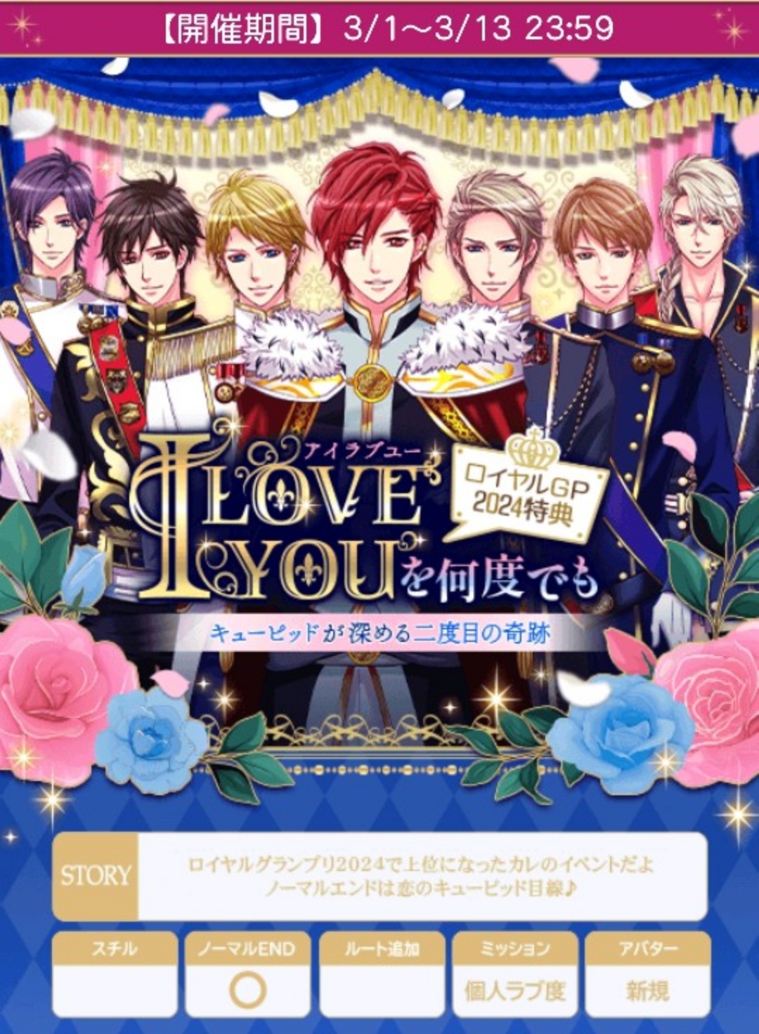 🌹クオンN「B:クオンくん、やるね」が正解でした。ごめんなさい🙇🍀26〜31日の本編パーティー数予測は100回前後🍀1〜13日のイベントパーティー数予測は270回前後(↑両方とも負け考慮なし)🌹ハピエン特典はラブレターです🌹ジーク×ケヴィンstage1修正しました🙇【3/1日(土)~3/13日(木)】『I love youを何度でも~ロイヤルGP2024特典 キューピッドが深める二度目の奇跡~』★個人ラブ度特典■30,000「銅の鍵(イヴァン)X3」■40,000「クリスタルフレームvol.1」■45,000「銅の鍵(イヴァン)X4」■50,000「クリスタルフレームvol.2」■55,000「銅の鍵(イヴァン)X5」■60,000「クリスタルフレームvol.3」■65,000「銀の鍵(イヴァン)X3」■ 80,000「銀の鍵(イヴァン)X5」■120,000「アナタの隣に寄り添うヤコフ」■ロイ早期3/4日24時迄に2H√クリアで「ハートに愛をこめてvol.1」■早期3/7日20時迄に4H√クリアで「ハートに愛をこめてvol.2」■後半早期3/11日24時迄に6H√クリアで「ハートに愛をこめてvol.3」★F予想■ロイ 3/1・2・3・4日20時■早期 3/5日20時■早期 3/6日20時〜/7日20時■後早 3/7・8・9・10・11日20時■中間 3/12日12〜24時■ラス 3/13日12〜24時自愛8,000総愛1H√15,000 (7,500)2H√44,000 (20,000)3H√70,000 (29,167)4H√99,500 (38,270)1N√168,000 (49,412)2N√189,000 (52,500)3N√210,000 (55,264)4N√231,000 (57,750)5N√252,000 (60,000)6N√273,000 (62,046)7N√294,000 (63,913)単価21,000■参考数値「愛結びNewYear◆〜7つの福に照らされて〜」(25年1月)自愛8,000総愛1H√15,000 (7,500)2H√44,000 (20,000)3H√70,000 (29,167)4H√99,500 (38,270)5H√139,500 (49,822)6H√184,500 (61,500)7H√227,000 (70,938)1N√168,000 (49,412)2N√189,000 (52,500)3N√210,000 (55,264)4N√331,000 (57,750)5N√252,000 (60,000)6N√273,000 (62,046)7N√294,000 (63,913)単価21,000♦️ヘンリー×ハロルド♦️stage1A:地図アプリは見てみた?★B:SNSで検索してみた?stage2A:無責任では?B:貴方はどうするつもり?★stage3(H)A:別にいいんじゃない?B:大丈夫★stage3(N)A:ふたりで出かけていた★B:やっぱり気にも留めなかった♦️ジーク×ケヴィン♦️stage1A:あるに決まっている★B:まだ先の話だstage2A:否定するB:認める★stage3(H)A:想像に巻かせるB:そのようなものだ★stage3(N)A:2人が羨ましいから★B:ノロケを聞かされたから♦️クオン×マックス♦️stage1A:怪我は?★B:ドレスは?stage2A:綺麗だB:まあまあ★stage3(H)A:そうだよB:それ以外ある?★stage3(N)A:おめでとうB:クオンくん、やるね★♦️ヤコフ×ミハイル♦️stage1A:あり得ないB:やはり怪しい★stage2A:何か言いかけなかったか?★B:扉はちゃんと閉めた方がいいstage3(H)A:もう十分買っただろうB:まだ買い足すのか★stage3(N)A:遠回しに断るB:素直に受け取る★■50文字の纏めヘ1地図2貴方H大丈N出◆ジ1決2認HそのN羨◆ク1怪我2まあH以外Nクオン◆ヤ1怪2言HまだN受🌹ランク特典■1〜90位■1〜100位(アプリ)「春の花とたわむれて」(ヘンリー、イヴァン、リュオ、ヤコフ)「金の鍵(イヴァン)X6」■1〜380位■1〜400位(アプリ)「春を満喫王子」(ジーク、クオン、レオンハルト)「金の鍵(イヴァン)X2」■1〜800位「金の鍵(イヴァン)X2」⚠️インテリアはありません