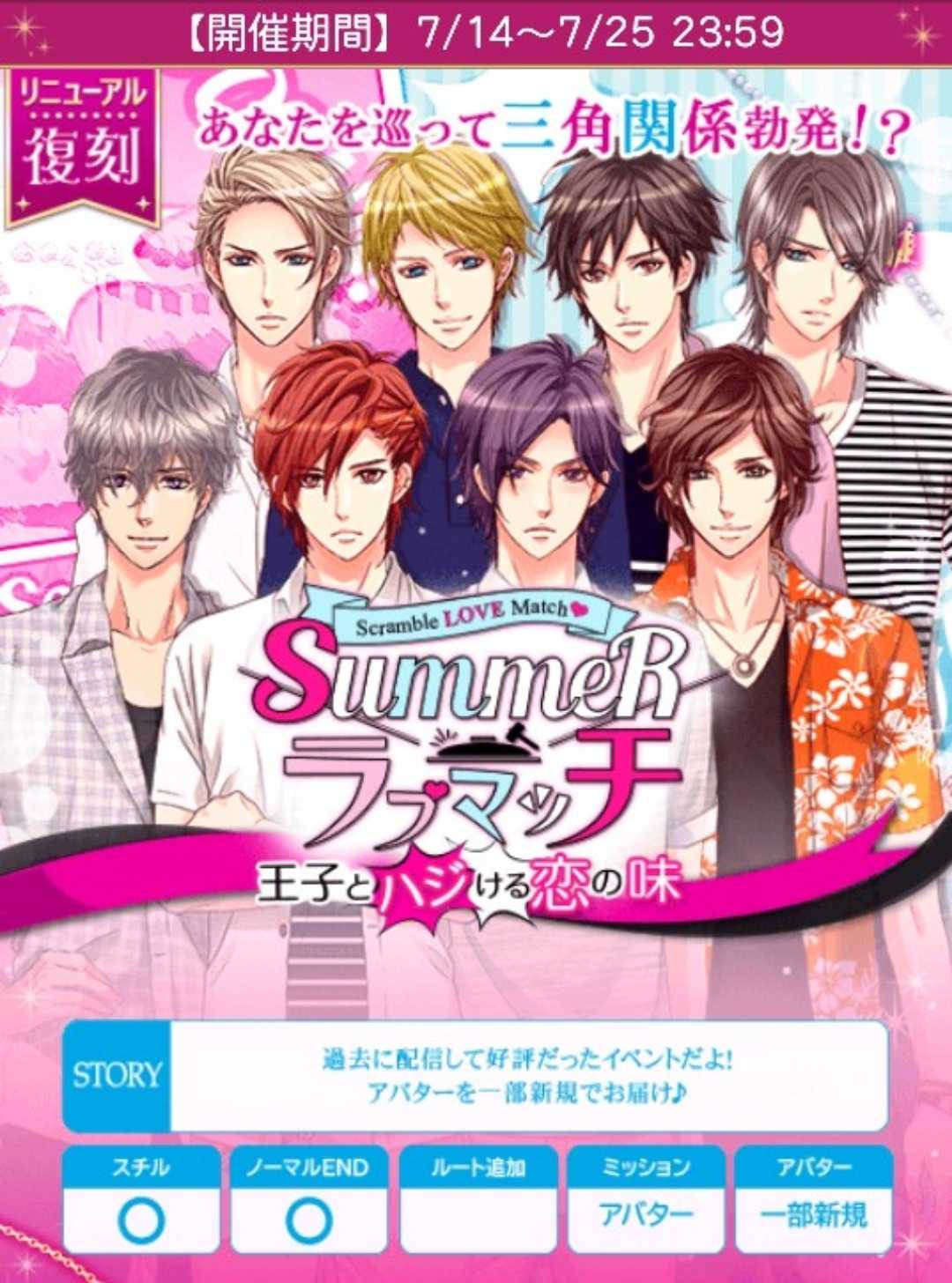 🌹アプリ版では新規になります🍀アンケート20日まで🆕24日FV予定修正しました🙇⚠️ラスFV半日は25日のみです【7/14日(月)~7/25日(金)】『復刻・Summerラブマッチ!〜王子とハジける恋の味〜』★個人ラブ度特典■25,000「銅の鍵(ミハイル)X3」■42,000「銅の鍵(ミハイル)X4」■50,000「銅の鍵(ミハイル)X5」■63,000「銀の鍵(ミハイル)X3」■68,000「ボイスメッセージ」■75,000「銀の鍵(ミハイル)X5」■100,000「アナタに大きな愛をbyミハイル」■120,000「でか王子の鍵」★個人ラブ度特典「1着クローゼット」■8,000■16,000■24,000■32,000■40,000■48,000■56,000■64,000■72,000■80,000■88,000■96,000■104,000■112,000■120,000■128,000■ロイ早期7/16日24時迄に2H√クリアで「浮き輪でバカンス王子」■早期7/19日20時迄に4H√クリアで「プールでわいわい王子」■後半早期7/24日24時迄に7H√クリアで「ハイビスカスでたそがれ王子」★F予想■ロイ 7/14日12〜24時■ロイ 7/15・16日20時■早期 7/17日20時■早期 7/18日20時〜7/19日20時■後早 7/19・20・21・22・23・24日20時■ラス 7/25日12〜24時自愛8,000総愛1H√15,000 (7,500)2H√37,500 (17,046)3H√59,800 (24,917)4H√88,800 (34,154)5H√116,500 (41,608)6H√150,000 (50,000)7H√191,000 (59,688)8H√214,500 (63,089)1N√205,200 (57,000)2N√228,000 (60,000)3N√250,800 (62,700)4N√273,600 (65,143)5N√296,400 (67,364)6N√319,200 (69,392)7N√342,000 (71,250)8N√364,800 (72,960)単価22,800♦️ヘンリーVSアスラン♦️アバM爽夏チェックシャツstage1A:皆で楽しもうと言う★B:自分がいていいのか確認するstage2A:自分で選んだ方がいいと言うB:言われた通り選んであげる★stage3(H)A:大切な思い出だから★B:嬉しかったからstage3(N)A:浴衣のデザインが可愛いかったからB:アスランと過ごしたかったから★♦️ジークVSミハイル♦️アバM透彩フリルシャツstage1A:苦手と言う★B:大丈夫だと言うstage2A:今度パンを焼きますB:何をすればいいですか★stage3(H)A:大丈夫★B:少しだけstage3(N)A:一緒に海が見たかった★B:海が好き♦️クオンVSクラレンス♦️アバM泡夏ドレスシューズstage1A:オリジナリティに欠けると却下B:面白い研究だからと賛成★stage2A:お風呂に入る★B:遠慮するstage3(H)A:クオンくんのこと好きなのかもB:雰囲気に呑まれてはいけない★stage3(N)A:気にしないでいいと言うB:私の上司だと普通に紹介する★♦️リュオVSシオン♦️アバM夏色ストライプバッグstage1A:自分は気にしない★B:年下はちょっと…stage2A:さすがだね★B:見つめるstage3(H)A:正直に話す★B:ごまかすstage3(N)A:ピーラーを勧める★B:他のことを頼む♦️オリバーVSレオンハルト♦️アバM編み上げショートパンツstage1A:わかると頷く★B:ちょっとわからないstage2A:楽しいし、嬉しい★B:人数は多い方がいいstage3(H)A:可愛いと褒めるB:もっと見たいとねだる★stage3(N)A:隣に行ってもいいですか?★B:本当に私でいいんですか?♦️ケヴィンVSジン♦️アバMペールカラーのチュールスカートstage1A:落ち着いてください★B:帰りますよstage2A:ちょっと似てるB:意外と仲がいい★stage3(H)A:全然気づかなかったB:そうかなと思ってた★stage3(N)A:ひどいです★B:趣味が悪い人♦️マックスVSルシオ♦️アバMフリンジトリオサンダルStage1A:マックス王子に声をかける★B:ルシオ王子に声をかけるStage2A:と、とにかく行きましょう!B:恥ずかしいのでやめてください★stage3(H)A:マックス王子に声をかける★B:そのまま黙っているstage3(N)A:何でここに?B:驚きすぎて何も言えない★♦️イヴァンVSティエン♦️アバMエアラインチョーカーstage1A:暑いのが苦手か聞く★B:気にしないでと言うstage2A:遠慮するB:お礼を言う★stage3(H)A:理由を聞く★B:珍しいと言うstage3(N)A:なんでもないと言うB:手をつなぎたいと言う★■50文字の纏めヘ1皆2BH大切Nアス◆ジ1苦手2何H大丈N一緒◆ク1賛2風H雰N上司◆リ1自分2さすがH正直N勧オ1頷2楽H見N隣◆ケ1落ち2仲H思Nひどい◆マ1マク2恥HマクN驚◆イ1暑い2お礼H理由N手🌹ランク特典■1〜90位■1〜100位(アプリ)「イルカの浮き輪で空の旅へ♪」「金の鍵(ミハイル)X7」「でか王子の鍵」■1〜380位■1〜400位(アプリ)「プールサイドでビーチバレー♪」「金の鍵(ミハイル)X2」「でか王子の鍵」■1〜800位「夏を満喫♪バーベキュー大会」「金の鍵(ミハイル)」