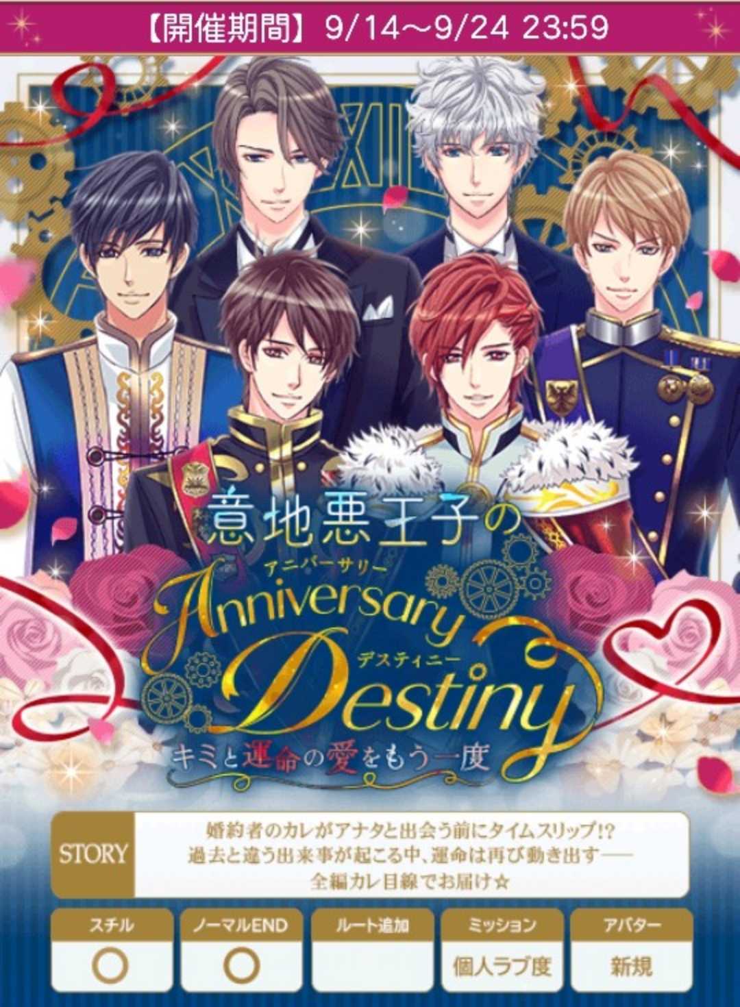 🌹アンケート20日まで【9/14日(日)~9/24日(水)】『意地悪王子のAnniversary Destiny~キミと運命の愛をもう一度~』🍀総愛&早期詳細&FV予定は前半参照♦️リュオ♦️stage1A:お前が喜ぶと思って★B:別にいいだろstage2A:製粉作業に興味がある★B:農家の実情に興味があるstage3(H)A:スマホに電話する★B:ノーブル城に電話するstage3(N)A:そんなことまでやり直したの?B:さすがリュオくんだね★♦️アスラン♦️stage1A:彼女の知り合いだと言う★B:おすすめを聞くstage2A:お化け屋敷B:メリーゴーランド★stage3(H)A:賛成する★B:反対するstage3(N)A:からかう★B:気付かない振りをする♦️シオン♦️stage1A:今俺と会ったことは忘れて★B:とにかくクオンを探してstage2A:人違いだと言うB:彼女をかばう★stage3(H)A:彼女はどこ?★B:今日って何日?stage3(N)A:私も同じ夢を見た★B:あれは現実だったのかな?🌹50文字の纏めリ1喜ぶ2製粉HスマホNさすが◆ア1知り合い2メリーH賛成Nからかう◆シ1忘れて2かばうH彼女N夢