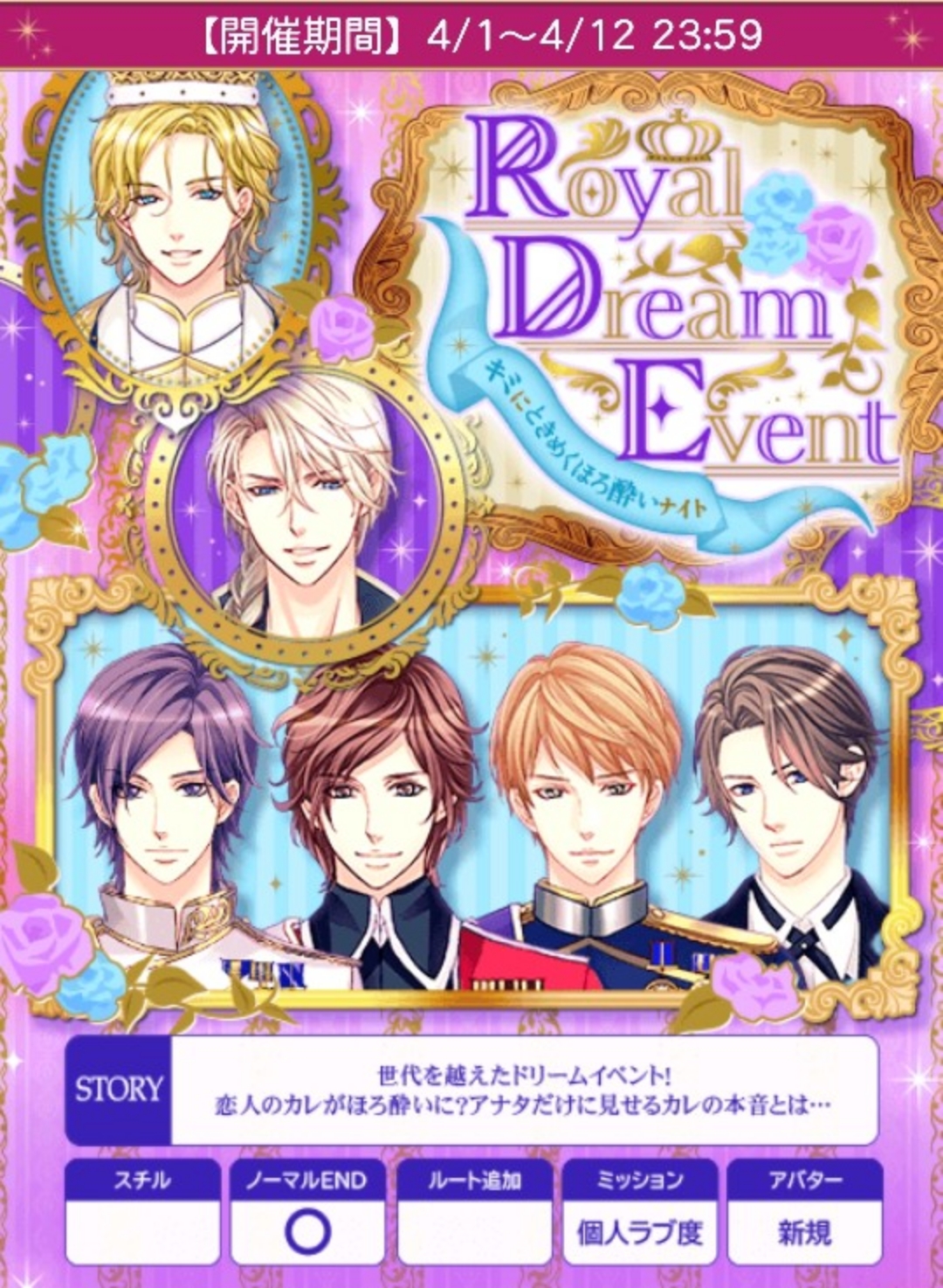 🆕お知らせにハピエン総愛が表示されました🆕🍀25〜30日の本編パチ数予測は100回前後🍀1〜12日のイベパチ数予測は260回前後(負けパチ考慮なし)🌹アンケ1日まで【4/1(火)~4/12(土)】『Royal Dream Event~キミにときめくほろ酔いナイト~』★個人ラブ度特典■27,000「銅の鍵(レオンハルト)X3」■42,000「銅の鍵(レオンハルト)X4」■54,000「銅の鍵(レオンハルト)X5」■63,000「銀の鍵(レオンハルト)X3」■75,000「銀の鍵(レオンハルト)X5」■120,000「レオンハルトからプリンセスへ花束を」■ロイ早期4/4日24時迄に2H√クリアで「プリンセスへ桜の花冠を」■早期4/6日20時迄に3H√クリアで「花より美しいプリンセス」■後半早期4/10日24時迄に5H√クリアで「桜を咲かせましょう」★F予想■ロイ 4/1・2・3・4日20時■早期 4/5日20時〜4/6日20時■後早 4/6・7・8・9・10日20時■中間 4/11日12〜24時■ラス 4/12日12〜24時🍀自愛8,000総愛1H√15,000 (7,500)2H√44,000 (20,000)3H√86,000 (35,834)4H√121,000 (46,539)5H√159,500 (56,965)6H√205,000 (68,334)1N√183,750 (57,422)2N√210,000 (61,765)3N√236,250 (65,625)4N√262,500 (69,079)5N√288,750 (72,188)6N√315,000 (75,000)単価26,250■参考数値「誘惑Melty sweet night~恋の秘薬と溢れる想い~」(25年2月)自愛総愛8,0001H√15,000 (7,500)2H√44,000 (20,000)3H√86,000 (35,834)4H√121,000 (46,539)5H√159,500 (56,965)6H√205,000 (68,334)1N√183,750 (57,422)2N√210,000 (61,765)3N√236,250 (65,625)4N√262,500 (69,079)5N√288,750 (72,188)6N√315,000 (75,000)単価26,250♦️ハロルド♦️stage1A:そんなにすぐ効くわけないB:笑いごとじゃない★stage2A:大丈夫です★B:少しぼーっとしてて……stage3(H)A:何の話ですか?B:あの時の話って……★stage3(N)A:なぜお前が張りきる★B:邪魔をするな♦️ジン♦️stage1A:何も言えずに黙りこむB:心配するようなことはないと言う★stage2A:ジンさんの言う通りにするB:ジンさんも一緒に飲んで★stage3(H)A:さすがにお酒は抜けた★B:そもそも誘ってないstage3(N)A:ぜひ口移しで★B:お楽しみにしておく♦️レオンハルト♦️stage1A:このあと、お仕事は?B:お酒はお好きですか?★stage2A:あのお菓子にお酒が……?★B:雰囲気に酔ったのでは……stage3(H)A:了承する★B:ちょっとからかうstage3(N)A:それも一理あるB:飲めるに越したことはな★い🌹50文字の纏めハロ1笑い2大丈夫Hあの時N張り◆ジン1心配2一緒HさすがN口移◆レオ1お酒2お菓子H了承N飲める🌹ランク特典■1〜90位■1〜100位(アプリ)「お酒とプリンセスに酔いしれて」(レオンハルト、ヤコフ、ハロルド)「金の鍵(レオンハルト)X6」■1〜380位■1〜400位「桜の木の下で盃を」(ジーク、オリバー、ジン)「金の鍵(レオンハルト)X2」■1〜800位「金の鍵(レオンハルト)X2」