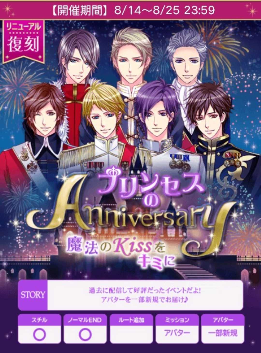 🌹こちらの選択肢情報は姫友サイトより写させて頂いています🍀アンケート20日まで【8/14日(木)~8/25日(月)】『【復刻】プリンセスのAnniversary ~魔法のKissをキミに~』★個人ラブ度特典■25,000「銅の鍵(ジーク)X3」■42,000「銅の鍵(ジーク)X4」■50,000「銅の鍵(ジーク)X5」■63,000「銀の鍵(ジーク)X3」■66,000イラスト「AnniversaryLove」■75,000「銀の鍵(ジーク)X5」■120,000「でか王子の鍵」★個人ラブ度特典「1着クローゼット」■8,000■16,000■24,000■32,000■40,000■48,000■56,000■64,000■72,000■80,000■88,000■96,000■104,000■112,000■ロイ早期8/16日24時迄に2H√クリアで「ノーブル城のお祝いアーチ」■早期8/19日20時迄に4H√クリアで「ガゼボでお祝い」■後半早期8/23日24時迄に6H√クリアで「ノーブル様とお祝い」★F予想■ロイ 8/14日12〜24時■ロイ 8/15・16日20時■早期 8/17日20時■早期 8/18日20時〜7/19日20時■後早 8/19・20・21・22・23日20時■中間 8/24日12〜24時■ラス 8/25日12〜24時自愛8,000総愛1H√15,000 (7,500)2H√37,500 (17,046)3H√59,000 (24,584)4H√89,000 (34,231)5H√127,500 (45,536)6H√168,000 (56,000)7H√212,000 (66,250)1N√168,000 (49,412)2N√189,000 (52,500)3N√210,000 (55,264)4N√231,000 (57,750)5N√252,000 (60,000)6N√273,000 (62,046)7N√294,000 (69,913)単価21,000♦️ヘンリー♦️アバMブルースターのヘアアクセブルーのフリルトップスstage1A:覚悟は決めてます★B:正直、先のことが怖いですstage2A:気づかず痩せるなんて羨ましいB:ちゃんと食事してますか?★stage3A:待って下さい、お願いが…★B:今、立て込んでいるので…stage4(H)A:束縛は良くないですよ?B:やっぱり、お茶を入れたい★stage4(N)A:食欲よりぬくもりを選ぶ★B:パンを決める間はこのままで♦️ジーク♦️アバM撫子色クラッチバッグパールの花かごstage1A:分かりました★B:不安ですstage2A:電話をするB:信じて待つ★stage3A:そのまま寝るB:メイクを落とす★stage4(H)A:連れてきましょうかB:もう少しいさせてあげましょう★stage4(N)A:写真に収める★B:そのまま見ている♦️クオン♦️アバMゴージャスパンプスリボンパールブレスレットstage1A:自ら先に降りるB:様子を見守る★stage2A:そうだと認める★B:肯定も否定もしないstage3A:クオンを止めるB:状況を見守る★stage4(H)A:まさか、と否定B:クオンに答えてもらう★stage4(N)A:行きたい★B:忙しい時間だからやめておく♦️ケヴィン♦️アバMアニバーサリーバルーングリーンストーンネックレス&ピアスstage1A:すぐに承知する★B:黙るstage2A:行かないと言う★B:迷うstage3A:私は行きませんB:出来る限りなサポートします★stage4(H)A:ありがとうございます★B:大丈夫ですからstage4(N)A:我慢、しなくていいか?★B:どうもしてねーよ♦️オリバー♦️アバMコスモスのイヤリングオレンジのヘッドアクセstage1A:迷惑がかかるんじゃ…★B:よろしくお願いしますstage2A:はい、喜んで★B:本当に最後なんですか?stage3A:ワザとじゃないと思いますB:たまたまですよ★stage4(H)A:私に出来ることなら言って下さいB:もっとワガママな事って何?★stage4(N)A:花、本当にありがとうB:また俺の作った服を着てくれる?★♦️マックス♦️アバMパールと薔薇のネックレスパープルリボンのスカートstage1A:呼び捨ては難しいですB:さん付けではどうですか?★stage2A:推進派を説得しましょうB:ブノワさんを説得しましょう★stage3A:緊張してます★B:緊張してませんstage4(H)A:わかりました★B:でも…stage4(N)A:全然問題ないよB:俺も一緒に手を振ろうかな?★♦️イヴァン♦️アバM肩掛けボレロハートのフラワーボードstage1A:何も言えないB:自分も行くと言う★stage2A:断る★B:承知するstage3A:無理だと言うB:どこにいるか聞く★stage4(H)A:ジッと見つめる★B:怒るstage4(N)A:帰りたくないと言う★B:帰っていいのかと聞く■50文字の纏めヘ1覚2食3待H茶N食欲◆ジ1分2信3落H少N写◆ク1様2認3状H答N行◆ケ1承2行3サポHありN我オ1迷惑2喜3たまHもっとN服◆マ1さん2ブノワ3AHわかりN俺も◆イ1自分2断る3聞くH見NA🌹ランク特典■1〜90位■1〜100位(アプリ)「白馬でエスコート王子」「金の鍵(ジーク)X7」「でか王子の鍵」■1〜380位■1〜400位(アプリ)「ノーブル城で大はしゃぎ」「金の鍵(ジーク)X2」「でか王子の鍵」■1〜800位「金の鍵(ジーク)」