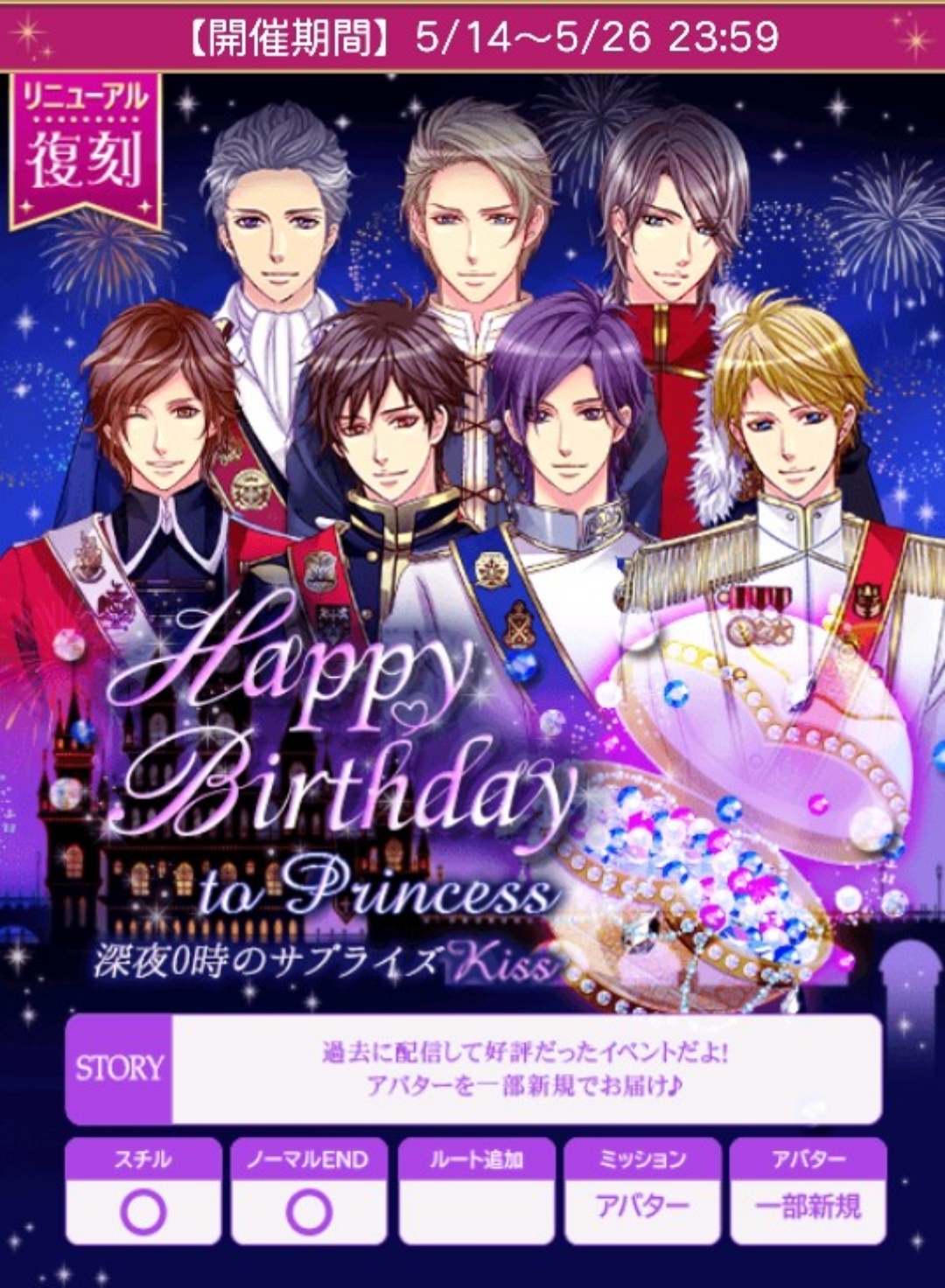 🍀アンケート5/20日まで【5/14日(水)~5/26日(月)】『【復刻】Happy Birthday to Princess~深夜0時のサプライズKiss~』★個人ラブ度特典■25,000「銅の鍵(マックス)X3」■41,000「銅の鍵(マックス)X4」■50,000「銅の鍵(マックス)X5」■60,000「銀の鍵(マックス)X3」■75,000「銀の鍵(マックス)X5」🆕100,000「リュオ目線限定ストーリー」■120,000「マックスからプリンセスへ花束を」「でか王子の鍵」★個人ラブ度特典「1着クローゼット」■8,000■16,000■24,000■32,000■40,000■48,000■56,000■64,000■72,000■80,000■88,000■96,000■104,000■112,000■ロイ早期5/16日24時迄に2H√クリアで「ショートケーキのソファー」■早期5/19日20時迄に4H√クリアで「誕生日の飾りつけベッドルーム」■後半早期5/24日24時迄に6H√クリアで「ケーキのらせん階段」★F予想🆕ロイ 5/14日12~24時■ロイ 5/15・16日20時■早期 5/17日20時■早期 5/18日20時〜5/19日20時■後早 5/19・20・21・22・23・24日20時■中間 5/25日12〜24時■ラス 5/26日12〜24時自愛総愛1H√15,000 (7,500)2H√38,000 (17,273)3H√60,300 (25,125)4H√90,000 (34,616)5H√132,000 (47,143)6H√184,000 (61,334)7H√227,000 (70,938)1N√186,000 (54,706)2N√209,250 (58,125)3N√232,500 (61,185)4N√255,750 (63,938)5N√279,000 (66,429)6N√302,250 (68,694)7N√325,500 (70,761)単価23,250■参考数値『I love youを何度でも~ロイヤルGP2024特典 キューピッドが深める二度目の奇跡~』自愛8,000総愛1H√15,000 (7,500)2H√44,000 (20,000)3H√70,000 (29,167)4H√99,500 (38,270)5H√141,000 (50,358)6H√187,500 (62,500)7H√231.000 (72,188)1N√168,000 (49,412)2N√189,000 (52,500)3N√210,000 (55,264)4N√231,000 (57,750)5N√252,000 (60,000)6N√273,000 (62,046)7N√294,000 (63,913)単価21,000♦️ヘンリー♦️アバM金糸雀レースワンピースチルデンニットstage1A:腕をふるって焼きますね★B:それはちょっと…stage2A:電話でロイドを呼び出すB:直接ロイドに頼みに行く★stage3A:諦めない★B:代用品を考えるstage4(H)A:飴細工を食べたいB:イチゴが食べたい★stage4(N)A:食べさせてあげようか?★B:慌てなくてもいい♦️ジーク♦️アバM金糸雀リボンのブーツオフホワイトレーススカートstage1A:すぐに電話をかける★B:ミニタオルを飾るstage2A:どうしようかなB:わかりました★stage3A:なにか用意を?★B:しょうがないですよstage4(H)A:可愛い!と言う★B:ジークの案ですか?と聞くstage4(N)A:髪を撫でる★B:しばらく見つめる♦️クオン♦️アバMトレンチ風ペプラムコート靴下付ローファーパンプスstage1A:「一緒にいたい」★B:「目が冴えてる」stage2A:「それはパン職人として…」★B:「そんなことは…」stage3A:「うん」★B:「どこに行くの?」stage4(H)A:嬉しいB:喜ばせてもらったよ★stage4(N)A:・・・・・・★B:仕方なくだよ!♦️オリバー♦️アバM金糸雀ヘアリボンリボンパールネックレスstage1A:ホームズの散歩を申し出る★B:ウェルナーに任せるstage2A:何かあったんですか?B:わかりました★stage3A:私もオリバー王子に会えて嬉しい★B:気にしないでstage4(H)A:色々って…?★B:違うデザインだったんですか?stage4(N)A:料理って難しい…★B:無理なのかも?♦️ケヴィン♦️アバMprettyホワイトポーチグログランパーティーイヤリングstage1A:なにもいらない★B:思いつかないstage2A:話す★B:迷うstage3A:ヤキモチですか?★B:どうしたんですか?stage4(H)A:思いつかないB:普通のデートがしたい★stage4(N)A:今から作ってやる★B:アパートでも作ってやる♦️マックス♦️アバMゴールドハートネックレス白のバケットハットstage1A:ありがとうございます★B:でも…stage2A:すぐにイチゴを買いに行く★B:他のフルーツで代用するstage3A:何も隠していませんB:内緒です★stage4(H)A:マックス王子のことを考えてたB:笑ってません★stage4(N)A:ブランケットを持ってくるB:キスする★♦️イヴァン♦️アバM金細工のカラーピアススクール風リュックStage1A:忘れたと言うB:大したことじゃないと言う★Stage2A:言いよどむ★B:あると言うstage3A:大丈夫だと言うB:話があると言う★stage4(H)A:寝落ちしたと言う★B:今もしていると言うstage4(N)A:ジーンズに訊くB:花屋に寄る★■50文字の纏めへ1腕2直接3諦めH苺N食べ◆ジ1電話2わかり3用意H可愛いN髪◆ク1一緒2職人3うんH喜ばせてN…オ1散2わか3私H色々N料◆ケ1何2話3焼H普N今◆マ1あ2苺3内H笑Nキス◆イ1大2A3話H寝N花🌹ランク特典■1〜90位■1〜100位(アプリ)「アナタにケーキをつくる王子」(ヘンリー、ジーク、マックス、イヴァン)「金の鍵(マックス)X7」「でか王子の鍵」■1〜380位■1〜400位(アプリ)「クラッカーでお祝い王子」(クオン、オリバー、ケヴィン)「金の鍵(マックス)X2」「でか王子の鍵」■1〜800位「金の鍵(マックス)」