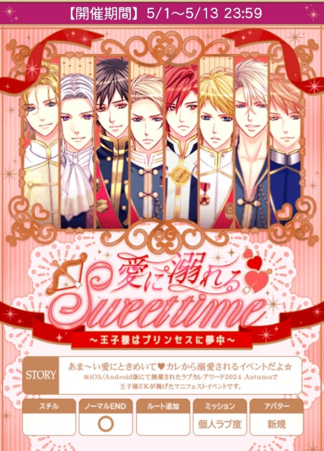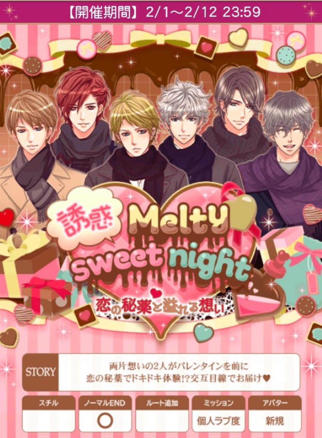 🆕ハピエン特典はアバターではなくラブレターです(受取期限2月12日。繰り越しはおそらく不可なので注意して下さい)🍀24~28日の本編パチ回数予測85回前後🆕ノマ総愛修正しました🙇【2/1日(土)~2/12日(水)】『誘惑Melty sweet night~恋の秘薬と溢れる想い~』★個人ラブ度特典■27,000「銅の鍵(ケヴィン)X3」■42,000「銅の鍵(ケヴィン)X4」■54,000「銅の鍵(ケヴィン)X5」■63,000「銀の鍵(ケヴィン)X3」■75,000「銀の鍵(ケヴィン)X5」■120,000「ケヴィンからプリンセスへ花束を」■ロイ早期2/4日24時迄に2H√クリアで「キミに捧げるバレンタインチョコ」■早期2/6日20時迄に3H√クリアで「チョコフォンデュ大満喫」■後半早期2/10日24時迄に5H√クリアで「手作り挑発おねだり王子」★F予想■ロイ 2/1・2・3・4日20時■早期 2/5日20時〜7/6日20時■後早 2/6・7・8・9・10日20時■中間 2/11日12〜24時■ラス 2/12日12〜24時🍀自愛8,000総愛1H√15,000 (7,500)2H√44,000 (20,000)3H√86,000 (35,833)1N√183,750 (57,422)2N√210,000 (61,765)3N√236,250 (65,625)4N√262,500 (69,079)5N√288,750 (72,188)6N√315,000 (75,000)単価26,250■参考数値『Lost memories of princess~何度でも、愛してるをキミに~』(24年8月)自愛8,000総愛1H√15,000 (7,500)2H√44,000 (20,000)3H√82,000 (34,167)4H√112,500 (43,270)5H√149,000 (53,215)6H√200,000 (66,667)1N√147,000 (45,938)2N√168,000 (49,412)3N√189,000 (52,500)4N√210,000 (55,264)5N√231,000 (57,750)6N√252,000 (60,000)単価21,000♦️ヘンリー♦️stage1A:どんなものが好きですか?★B:いつもどのくらい貰いますか?stage2A:受け取る★B:拒否するstage3(H)A:反抗するB:トレイで顔を隠す★stage3(N)A:言ってくれるのを待つB:自分から言う★♦️ケヴィン♦️stage1A:拍手するB:驚く★stage2A:反省する★B:開き直るstage3(H)A:嬉しい★B:信じられないstage3(N)A:うなずく★B:迷う♦️レオンハルト♦️stage1A:さすがですね★B:詳しいんですねstage2A:お前には関係ないだろうB:考えるのは当然だろう★stage3(H)A:もちろんです★B:聞かなくてもいいんですよ?stage3(N)A:眠れましたか?★B:早いですね🌹50文字の纏めヘ1好き2受取H隠すN自分◆ケ1驚く2反省H嬉しいNうなずく◆レ1さすが2当然H勿論N眠れました🌹ランク特典■1〜90位■1〜100位(アプリ)「お菓子の家でパーティー」(ヘンリー、マックス、リュオ)「金の鍵(ケヴィン)X6」■1〜380位■1〜400位(アプリ)「チョコの像をお披露目」(ケヴィン、ミハイル、レオンハルト)「金の鍵(ケヴィン)X2」■1〜800位「金の鍵(ケヴィン)X2」(⚠️インテリア特典はありません)