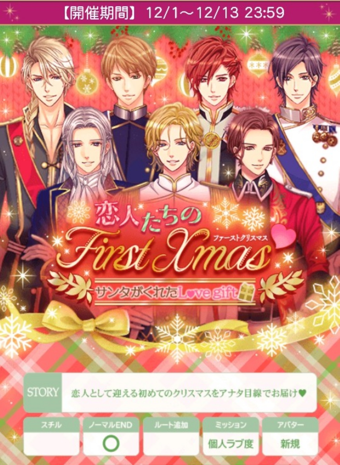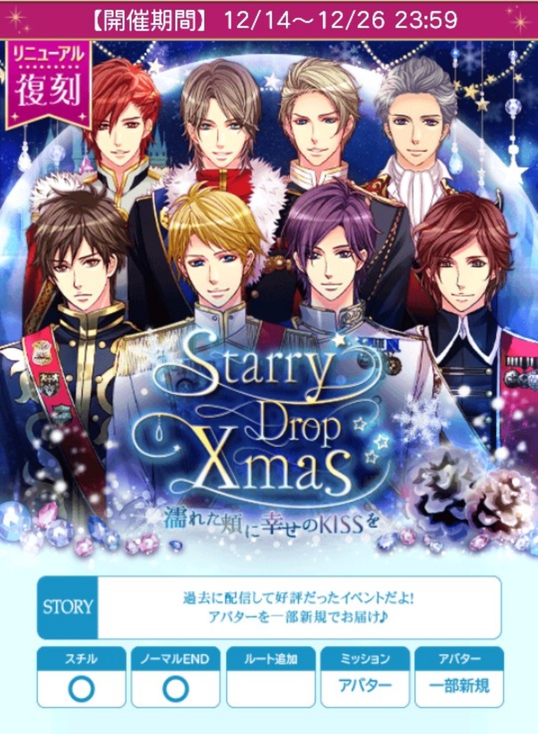 🌹アプリは初配信、ソシャゲは復刻になります🍀アンケート20日まで🍀リュオを入れ忘れてました。ごめんなさい🙇『【復刻】Starry Drop Xmas~濡れた頬に幸せのKISSを~』【12/14(土)12時〜12/26(木)24時】★個人ラブ度特典(予測)■25,000「銅の鍵(リュオ)X3」■41,000「銅の鍵(リュオ)X4」■45,000「【Xmas】サプライズ特典ストーリー」■50,000「銅の鍵(リュオ)X5」■60,000「銀の鍵(リュオ)X3」■75,000「銀の鍵(リュオ)X5」■120,000「でか王子の鍵」★個人ラブ度特典「1着クローゼット」■8,000■16,000■24,000■32,000■40,000■48,000■56,000■64,000■72,000■80,000■88,000■96,000■104,000■112,000🆕120,000🆕128,000■ロイ早期12/16日24時迄に2H√クリア「イルミネーションで冬を満喫」■早期12/19日20時迄に4H√クリア「大きなクマと冬を満喫」■後半早期12/24日24時迄に7H√クリア←⚠️注意❗「狼ぞりで冬を満喫」★F予想■ロイ 12/14・15・16日20時■早期 12/17日20時■早期 12/18日20時〜7/19日20時■後早 12/19・20・21・22・23・24日20時■中間 12/25日12〜24時■ラス 12/26日12〜24時自愛8,000総愛1H√15,000 (7,500)2H√33,800 (15,364)3H√56,500 (23,542)4H√84,800 (32,616)5H√112,500 (40,179)6H√145,000 (48,334)7H√184,000 (57,500)8H√234,000 (68,824)1N√189,000 (52,500)2N√210,000 (55,264)3N√231,000 (57,750)4N√252,000 (60,000)5N√273,000 (62,046)6N√294,000 (63,914)7N√315,000 (65,625)8N√336,000 (67,200)単価21,000■参考数値『ラブハプニングFirst Night~キミのすべてを愛したい~』(24年11月)自愛8,000総愛1H√15,000 (7,500)2H√44,500 (20,228)3H√66,000 (27,500)4H√90,700 (34,885)5H√112,400 (40,143)6H√140,850 (46,950)7H√183,750 (57,422)8H√244,750 (71,986)1N√189,000 (52,500)2N√210,000 (55,264)3N√231,000 (57,750)4N√252,000 (60,000)5N√273,000 (62,046)6N√294,000 (63,914)7N√315,000 (65,625)8N√336,000 (67,200)単価21,000♦️ヘンリー♦️アバMシンプルラフコートハートと雪のネックレスstage1A:そういうものですよ!★B:ヘンリーは違うんですか?stage2A:本当ですか?★B:どこに行く?stage3A:歌声について訊くB:様子について訊く★stage4(H)A:恥ずかしい!B:ヘンリーこそ!★stage4(N)A:無言★B:関係ない♦️ジーク♦️アバMラフブラウスニットブーツstage1A:皆が参加出来るパレード★B:城をクリスマス仕様にライトアップstage2A:館内を見て回ります★B:外を散歩してきますstage3A:ドアに近付いてみる★B:息をひそめるstage4(H)A:ジークらしいですねB:無理しないで下さいね★stage4(N)A:お礼を言うB:お前の方が似合っていたと言う★♦️クオン♦️アバMふわっとショートブーツファーバスケットバッグstage1A:誤魔化してると感じ追及するB:誤魔化してると感じるも我慢する★stage2A:メイドさんは片付けなかったの?B:忙しかったの?★stage3A:おかえりなさい★B:おつかれさまstage4(H)A:これは、嬉し涙だよB:こっちこそゴメンね★stage4(N)A:泣かないで…★B:ごめん、俺なんかやっちゃった♦️オリバー♦️アバMハートジーンズ雪のヘアアクセstage1A:はいと頷くB:我に返り王子達に謝る★stage2A:去年の様子を教えるB:見てからのお楽しみだと言う★stage3A:冬のラブロマンス★B:雪国を舞台にした冒険譚stage4(H)A:私も同じ気持ちです★B:オリバーより私の方が幸せstage4(N)A:どうしたのか聞くB:その顔は何かおねだり?★🍀🍀🍀後半は12月19日20時配信です🍀🍀🍀♦️ケヴィン♦️アバMパールチェーン付きクラッチバッグひらひらピンクスカートstage1A:強引に見せる★B:じゃあ、いいですと言うstage2A:じっと見つめるB:直接、尋ねる★stage3A:部屋を間違えた★B:コーヒーを淹れたstage4(H)A:別に置いてきたわけでは……B:カレンダーが気になったんです★stage4(N)A:マックスに電話する★B:ヘンリーに電話する♦️マックス♦️アバM雪うさぎピアス雪のポンチョstage1A:なんとか思い出してもらうB:誰か覚えていそうな人を探す★stage2A:行ってみたいですね★B:写真、上手ですねstage3A:はい!★B:いいんでしょうか?stage4(H)A:はい!★B:驚きましたかstage4(N)A:可愛い奥さんがいて★B:陽気な仲間たちがいて♦️イヴァン♦️アバM雪だるまマフラーファー手袋Stage1A:一緒にいられればそれでいい★B:無理しないでStage2A:具合が悪いのか聞くB:顔が赤いと言う★stage3A:自分が出ると言う★B:大丈夫か聞くstage4(H)A:先に入ってB:恥ずかしい★stage4(N)A:正直に話す★B:秘密だと言う♦️リュオ♦️アバM猫耳ニット帽ハートのタートルネックstage1A:必要なものって?B:何も聞かない★stage2A:見守る★B:声をかけるstage3A:ひき止める★B:ひき止めないstage4(H)A:リュオくんはどうするの?★B:一体何があるの?stage4(N)A:拒否するB:周囲を気にする■50文字の纏めヘ1そう2本3様HヘN無◆ジ1皆2館3ドH無N似◆ク1我2忙3帰HごめN泣◆オ1謝2見3冬H同N顔ケ1見2尋3部H気Nマ◆マ1誰2行3はHはN奥◆イ1一緒2顔3出H恥N正◆リ1聞2見3AHリN周🌹ランク特典■1〜90位■1〜100位(アプリ)「イルミネーションでわいわい」(ヘンリー、イヴァン、リュオ)「金の鍵(リュオ)X6」「でか王子の鍵」■1〜380位■1〜400位(アプリ)「イルミネーション列車に乗って」(ジーク、クオン、オリバー)「金の鍵(リュオ)X2」「でか王子の鍵」■1〜800位「スターライトにお座り」(ケヴィン、マッ
