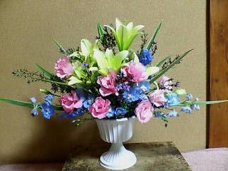 さて、昨日のお華はアレンジメントでした。花材は「イブニングスター(紫のちっさい花)・イエロークイーン(百合のような花)・ニュウサイライン(尖った葉)・トルコ桔梗(ピンク)・デルフィニューム(水色)」です。イブニングスターがまだ小さいけど、もっと大きく開くらしい。楽しみだな~