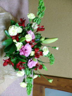今週は毎日ずっと激務・・・。2週間前くらいからずっと体調くずしてて、治ったと思ったら仕事が忙しく・・・。しんどいわ~~右下腹がちょっと痛くて(これも2週間前から)病院の先生にも相談したけど、盲腸の場所に近いけどそんな心配するほどひどい痛みでもないからしばらく様子を見ようといわれ・・・。確かにそんなに「痛い!」というような痛みではないんだけど気持ち悪い痛さなんだよね。ということで暫くは無理せず週末はゆっくり体を休めます。お茶とお華のお稽古は相変わらず頑張ってるけど今週はお休み。少し前の花だけど、3日に作ったアレンジメントの写真です「ケーキフラワー」という形のお花です。カーネーションと薔薇とレースフラワー。アレンジメントはやっぱり楽しいわ~!!これからもずっと続けたいな