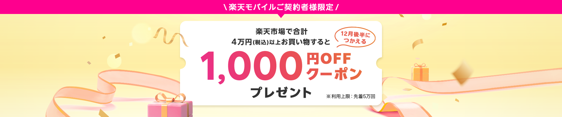 「アフィリエイト広告を利用しています」myクーポン見たら こんなクーポンが届いてました(;´∀`)【楽天モバイルご契約者様】SPU上限到達および到達間近の方へ!先着50,000注文まで使える1,000円OFFクーポン(2024/12/18~12/31)こんなキャンペーンあったんですねww キャンペーン名 : 楽天モバイルご契約者様限定!対象期間中の購入金額合計40,000円(税込)以上で12月18日(水)から使える!1,000円OFFクーポンプレゼントこれはありがたい(*´艸`*)