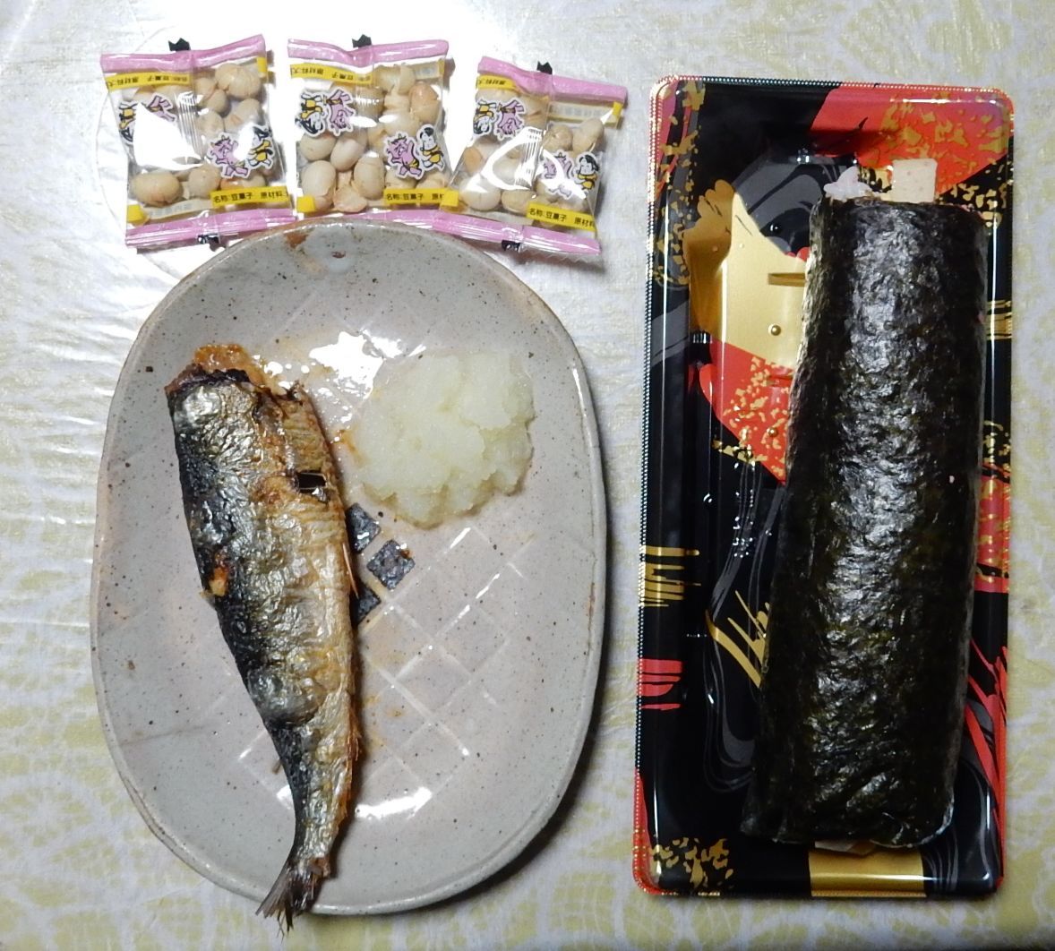 夕、巻寿司、鰯の塩焼き、蕎麦