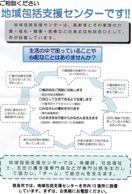 今回は奈良市が13地域に設置している高齢者を対象にした介護や福祉・医療にかかわる相談施設「地域包括支援センター」についての説明会で、介護保険やデイサービス等の現状の説明もして頂き、中々良くわかるお話しでした。