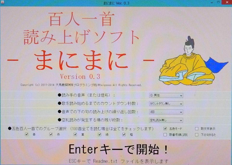 百人一首読み上げソフト「まにまに」を使って練習しましたが、婆っちゃんとは殆ど互角で、対等に勝負していました。