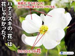 ハナミズキは、明治45(1912)年、当時の東京市長・尾崎行雄がアメリカ・ワシントン市の親日家たちにサクラの苗木を送った返礼として、大正4(1915)年に日本に送られてきました。観賞の対象となっている花は、本来の花弁ではなく、総苞片(花のつけ根の葉)です。そのため観賞期間も長く、秋の紅葉や赤熟した果実なども楽しめ、また、自然に樹形が整う木であることから、街路樹、公園木のほか、個人庭園のシンボルツリー、景観木としても広く利用されています。