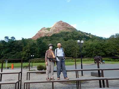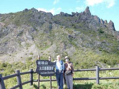 昼頃に洞爺湖町に到着し、車で壮瞥へ。有珠山のロープウエイでへ、眼下に広がる昭和新山に見とれながら山頂駅へ移動。展望テラスで下界を見下ろして、すばらしい景色を眺めた後、火口原展望台まで歩きました。