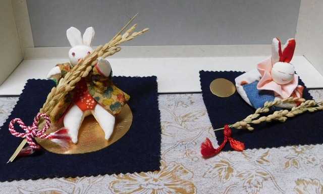 婆っちゃんの試作した来年の干支、子ネ、ウサギのお人形親子です。