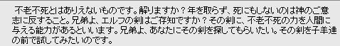 台風、きましたね~。仕事が自宅待機(実質、お休みですね)になりました。わ~い♪でも、出勤はしたんです。着いたら、入り口に人がたまってました。(><)もっと、はやく待機って決断してよ~、上の人。で、帰ってきて早速RS。「神が許したこと」クエを行いました。lv80からうけれる、経験値72万、お金5万がいただける、美味しいクエ。子羊たちに「不老不死なんて、あるわけねぇやろ!ばかやろう!!」と言いたくて、うずうずしている訳ですね。そのためには、証拠の品が必要。「エルフリーダー」の剣を、手に入れに向かいました。場所は「怒ったオーガ」と同じマップ、右端の森の中。リーダー、他のエルフさん達と違って服が違います。いい服、着てるんですね~。この間よさげな鎧を拾ったのですが、次の日によさげな肩当てを露店で見つけてしまい、私はまた裸族です。関係ないですね。戦いました。殺されました。服の事考えてたら、あらら。wすぐに古都まで戻って、リベンジは果たしましたが...なさけない~。クエ品を渡して、報酬をいただきましたが、役に立ったのか剣は。「不老不死、あほな事言うてんで、神さん信じてたらよろしいやないか~。」という証明になったのでしょうか?それとも、クエタイトル通りの結果なのか...。神仏信じてない私は、どうなったのか気になるのでした。