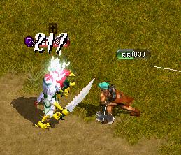 なんでかいまどきタイマン。流行はとうに終わっております。知ってますとも、でも出会っちゃったんやから、仕方がない。流行なんかに乗るかー、退行あるのみ! で、「鷲王」。私は、ただ『滝』を目指してただけなんですけど。こんな所で、出会うとは...。出会ったからには、タイマンですよね~。気にし過ぎなのかもしれませんが、『滝』への通り道なんでギャラリーが行ったり来たり。wなんか、恥ずかし~。私、この時買い物に行くつもりでして、『滝』に着いたらやめようとしてたんですね。それなのに、「鷲王」...。いつも、タイミング悪すぎです。そこへ、通りすがりのWiz様が、エンチャとヘイストをかけてくれました。ありがとうございます。買い物と「鷲王」との板挟み、早くゲームやめなきゃあかん!って思ってたので、うれしかったです。このWiz様、お名前をどこかのブログで見たおぼえがあるんですけど...。で、やっとフィニッシュ。助けをかりましたが、初めて勝った!うれしい~。うれしいついでに、買い物をすませて『滝』へ初めて進入してみました。タイマン...の筈やったのに、一発でやられてしもた。ポータル入ったところに、おるんやもん。気を取り直して、彷徨う私。最後は「てんぷら」。こんな事してたから、レベルまた上がらなかったよー。(^^;)