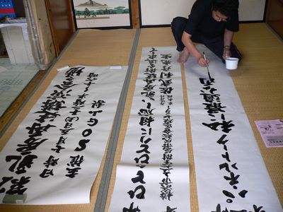 でました~~~~~~~~~風呂屋のおやじ やっぱり風呂桶を持って書く書家ちょっと褒める事って言えば原稿と紙を見るとバッチリ文字が入る事・・・書家だから当たり前かぁー当日看板張りもやらせましょう昨日の日日新聞(山梨地元新聞)のイベント情報に掲載されました。今日は伝言メモに掲載されました~~でも圧倒的に県外者の申し込みが多い。病気をシークレットにしている人が多いので小さい町では講演会に出席しただけで噂になるからねー知り合いも多いし。その点甲府とか大きい町の方が地元の人は来やすかったかも。100人定員なので申し込みする方は早めにお願いしますね~