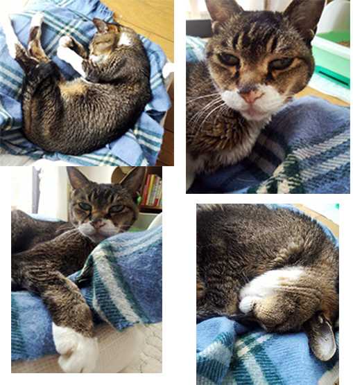 最近、点滴の準備に気がつくとウロウロ始めるチビクッションにのせて点滴をしているのでそこから離れていく今日は点滴をぶら下げ、クッションの位置を整えていると案の定ソソクサ逃げ出し1階の母のベッドまで降りて行ってしまった降りて逃げたところで抱きかかえられて戻されるのに・・・ 母に連れ戻されて”にゃあにゃあ”注射を刺されるのは嫌だよねそれも毎日の事だもの・・・・逃げたい気持ちはよくわかる私だって1回で刺して終らせてあげたいよだけどもがくといくら押さえていたって針は抜けてしまうんだよ私も1回で終るよう頑張るからチビも頑張れ!!