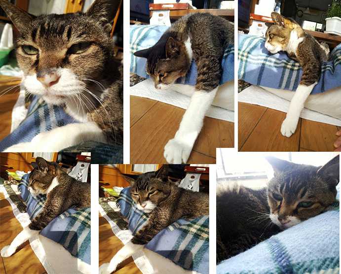 点滴前のお休み風景 今日は1回で上手く点滴が終わった刺す場所はほぼ特定できたって感じ上手く入るとチビも穏やかに点滴中過ごしているし明日も上手くいきますように!で、今日はポトスの整理と引き出しの整理浴室のアスパラガスがいい感じに伸びてきたので植え替えてあげないと!!