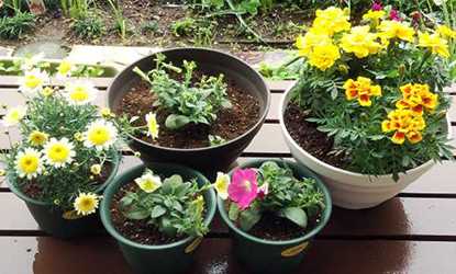 霧雨の中、デッキでやっとこさ植木鉢に買ってきたお花を植えた黄色のマーガレット・マリーゴールド・ペチュニアペチュニアは花芽を増やすために摘心すると良いというので思いっきりしてみた本当は全部の花を取ってしまったほうが良いのかもしれないけど・・・そして切ったのを挿し木に。上手く根が張って育つと良いなあ~ で、折角咲いていたお花を可哀想なくらい摘んでしまったので しばらくの間カップに挿して楽しむことに。 そして先日植え替えたポトスの剪定ヘゴの支柱を外して別の支柱に変更だいぶスッキリしてしまった ヘゴの支柱から外したときに折れてしまったり切れてしまった枝は整理してお部屋で水栽培開始 裏庭のカラーが何本も咲いてた切って花瓶に!って思うけどなかなか切れません・・・・ プランターの初夏ほうれん草がやっと芽を出した他のはもう少し伸びたら間引きしないと。