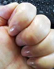 左はしっかりグー出来るんだけど、右の中指はしっかり曲げられないし痛い・・・