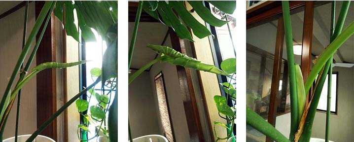 自室のモンステラ 昨日から今日 たぶん明日には開くでしょう    もう1本芽が出てきていた