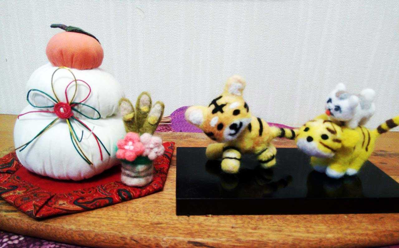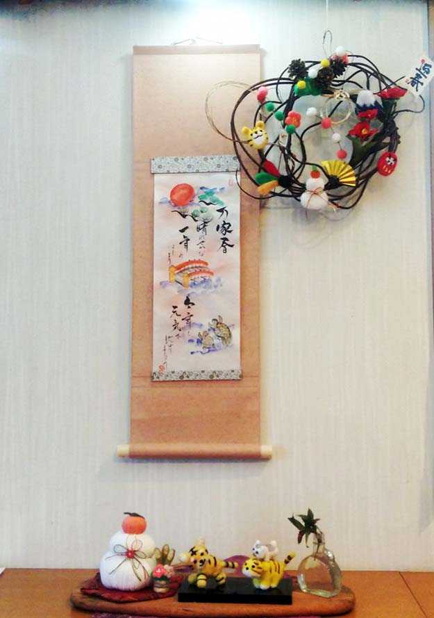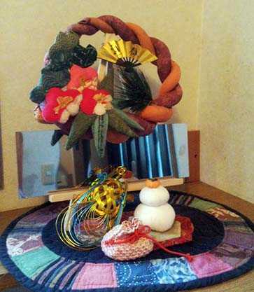 玄関の棚には母が往年に作ったパッチワークのリースと鏡餅・水引の亀