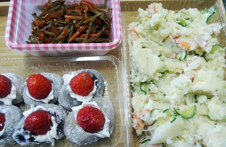なのでちょっと歪なシフォンケーキと苺大福とポテトサラダと金平ゴボウを持って