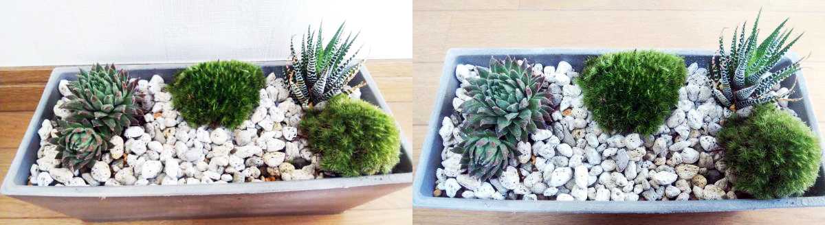 そして小粒軽石を敷いた器に多肉植物と苔を配置