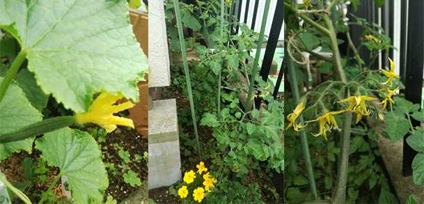 胡瓜の花と赤ちゃん胡瓜  トマトとトマトの花 根元にマリーゴールド