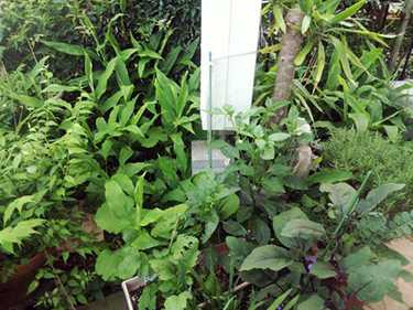 手前はローズマリー・茄子・カラーピーマンピーマンのプランター